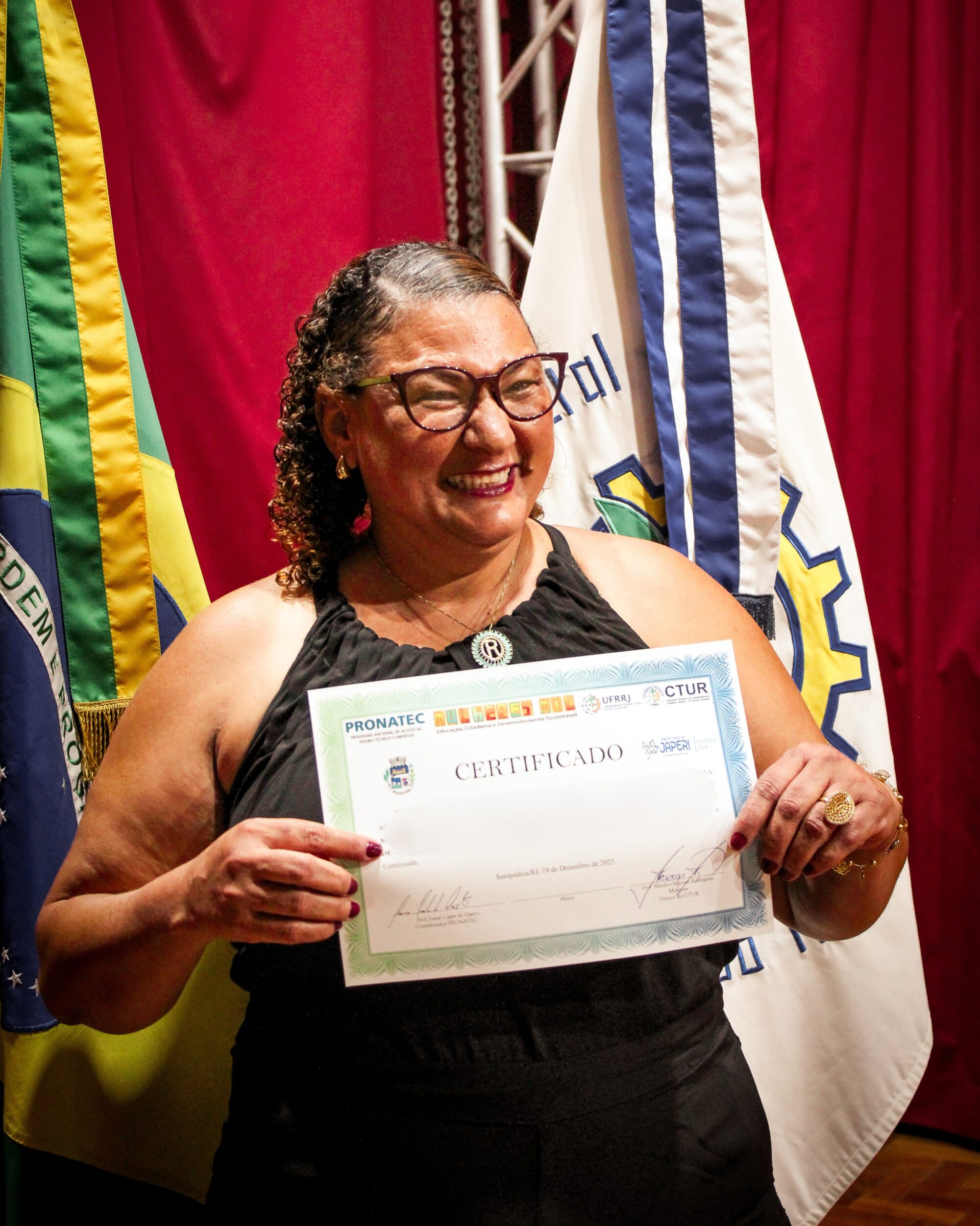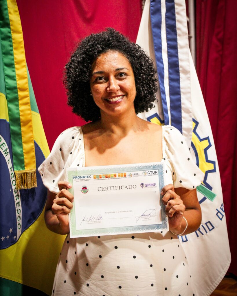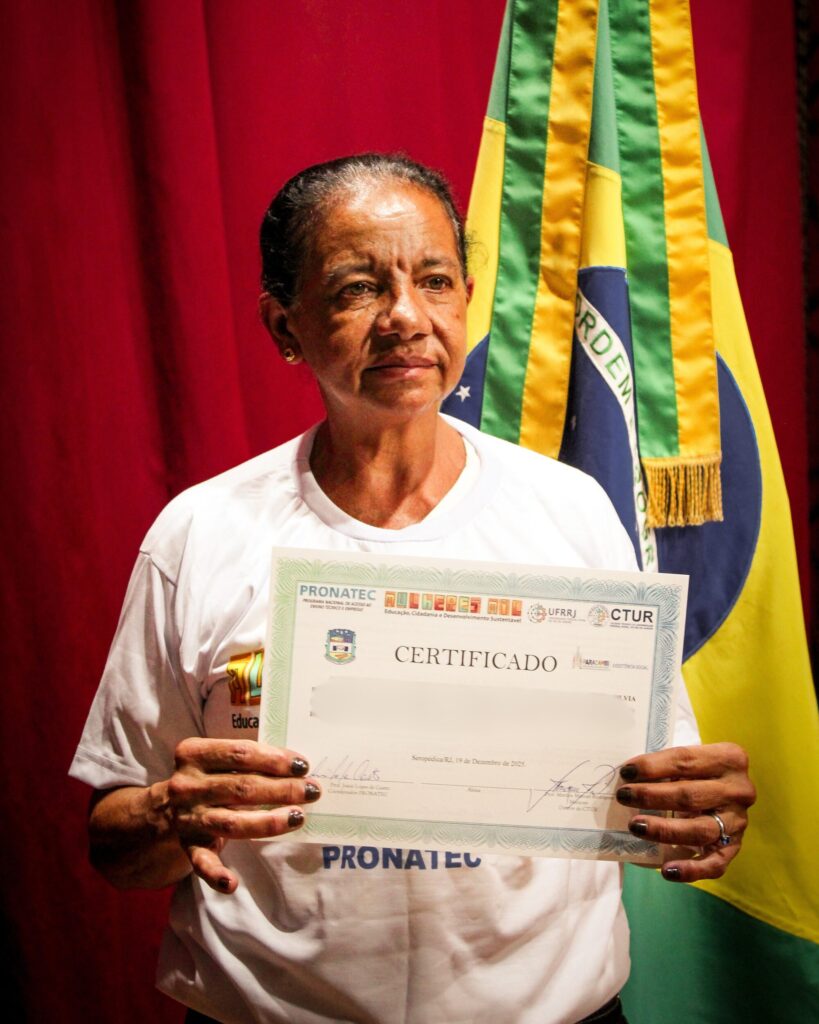 A família foi convidada a receber a homenagem em sua memória, entregue por Raquel Cortes, em nome do PRONATEC e da Secretaria da Mulher de Seropédica, como forma de reconhecimento à sua participação e à contribuição deixada ao longo do processo formativo.