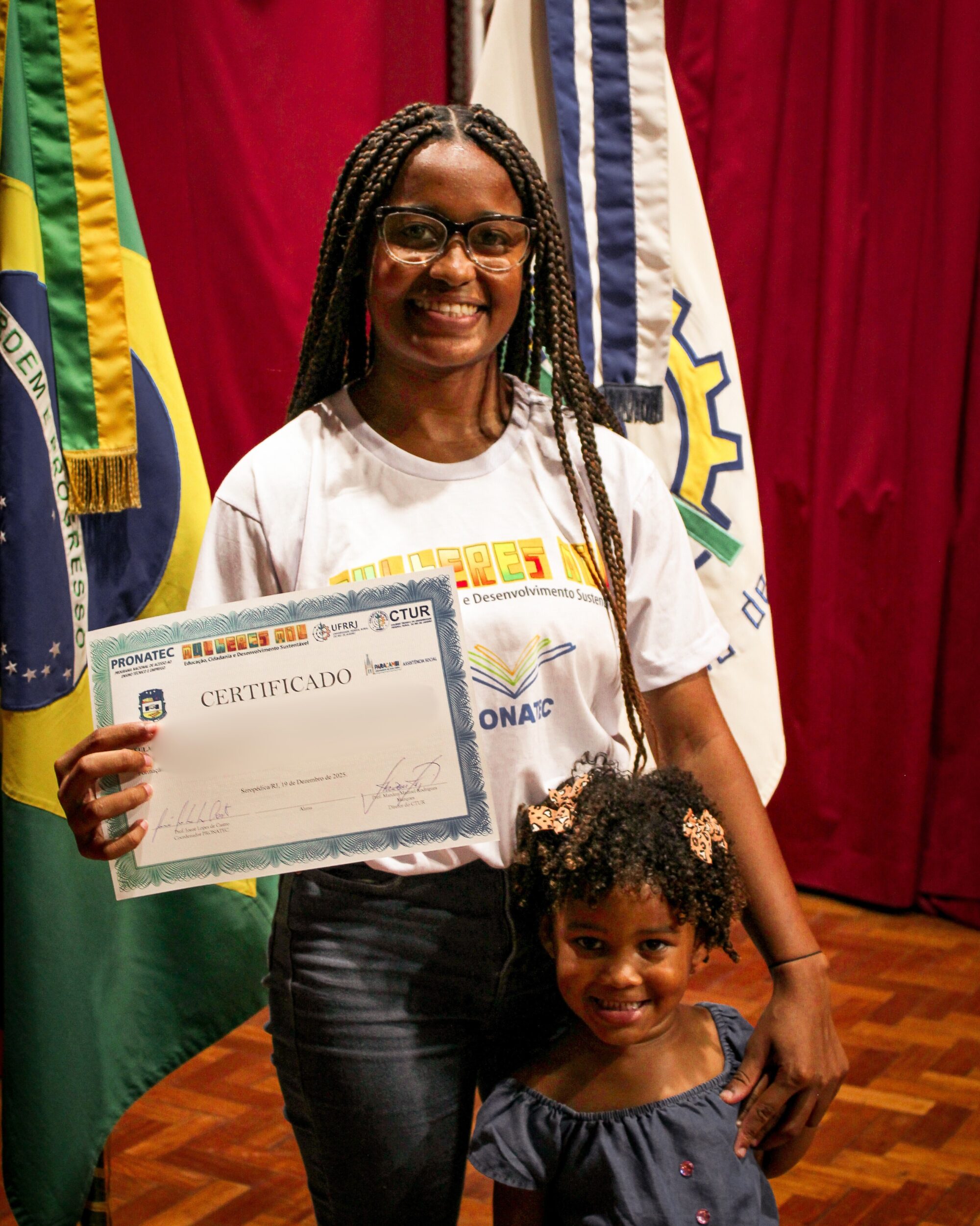 Compuseram a cerimônia o pró-reitor adjunto de Extensão da UFRRJ, professor Marcos Pasche; o diretor do CTUR, o professor Marden Marques e o coordenador do Curso PRONATEC Mulheres Mil, professor Josué Castro. As concluintes também receberam uma homenagem especial da professora Werica Assis, em reconhecimento ao empenho e à trajetória construída ao longo do curso.