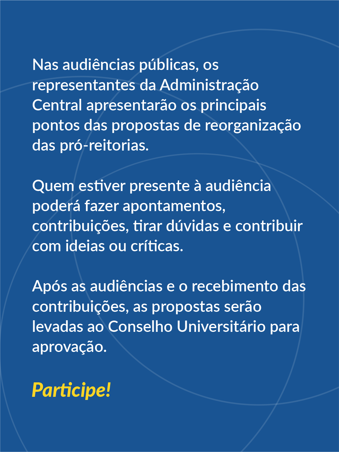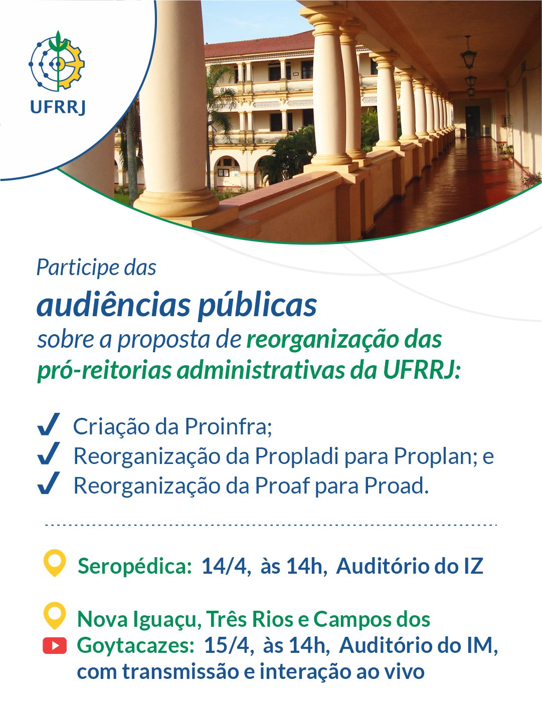 A Administração Central da Universidade Federal Rural do Rio de Janeiro convida a comunidade universitária a participar das audiências públicas sobre a proposta de reorganização das pró-reitorias administrativas da UFRRJ.