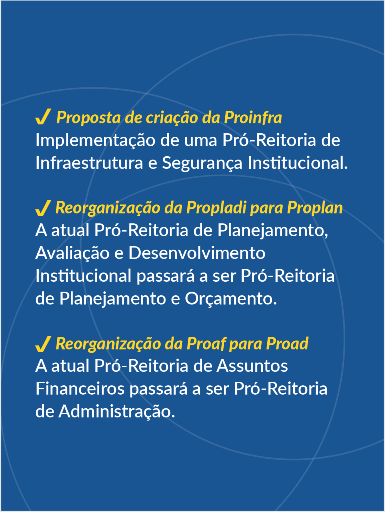 A proposta é criar uma nova pró-reitoria, a Proinfra – Pró-reitoria de Infraestrutura e Segurança Institucional;