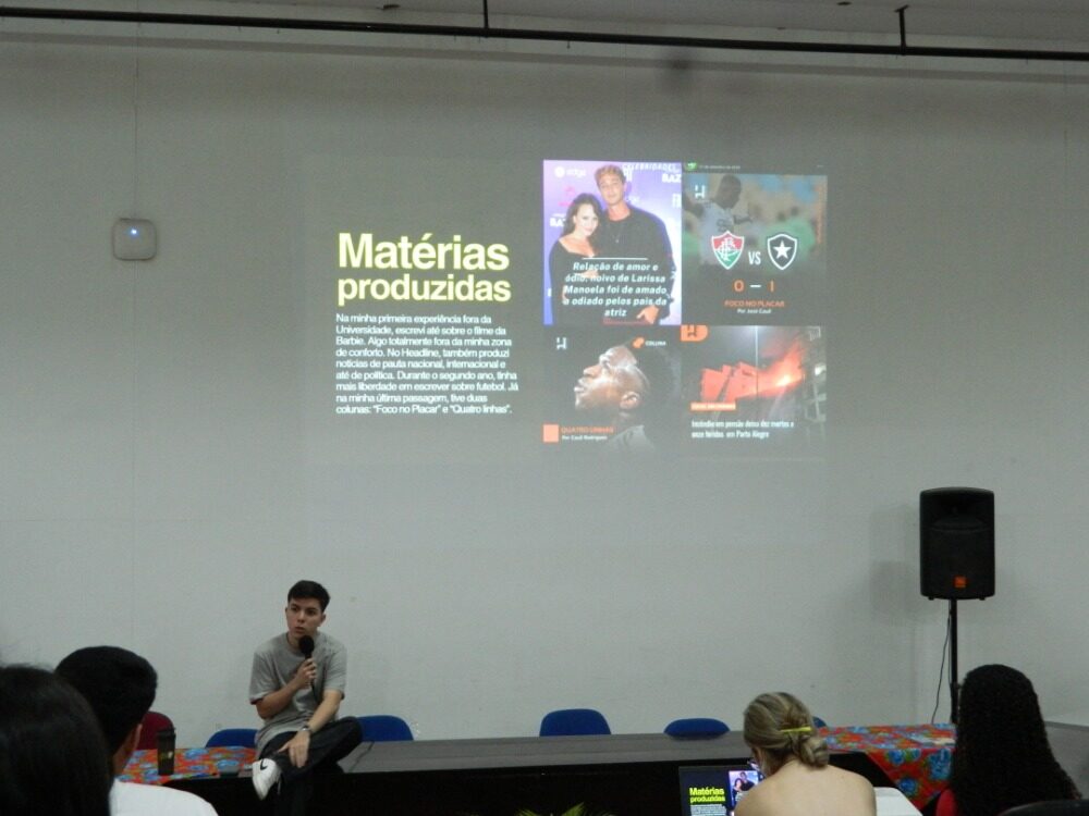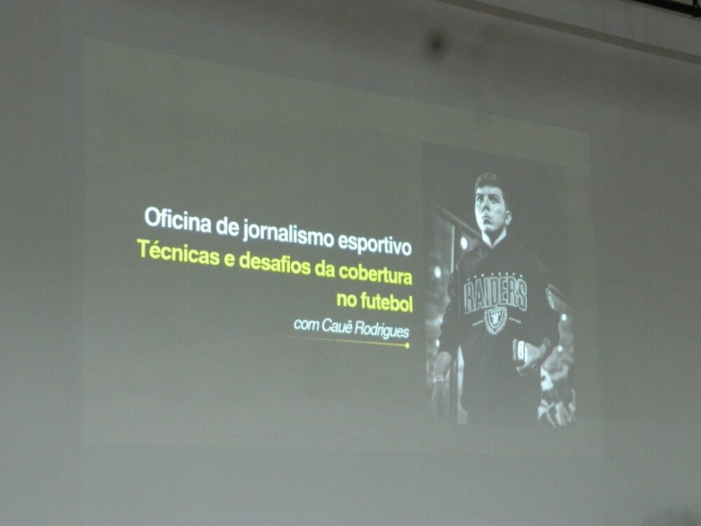 Dando início ao encontro, Cauê compartilhou suas experiências em coberturas esportivas e apresentou os principais métodos utilizados por repórteres da área. Entre os pontos abordados, ele destacou as facilidades e dificuldades da cobertura, como: o contato com atletas e assessorias, o planejamento de conteúdos para diferentes plataformas e a convivência com a imprensa dentro dos estádios.
