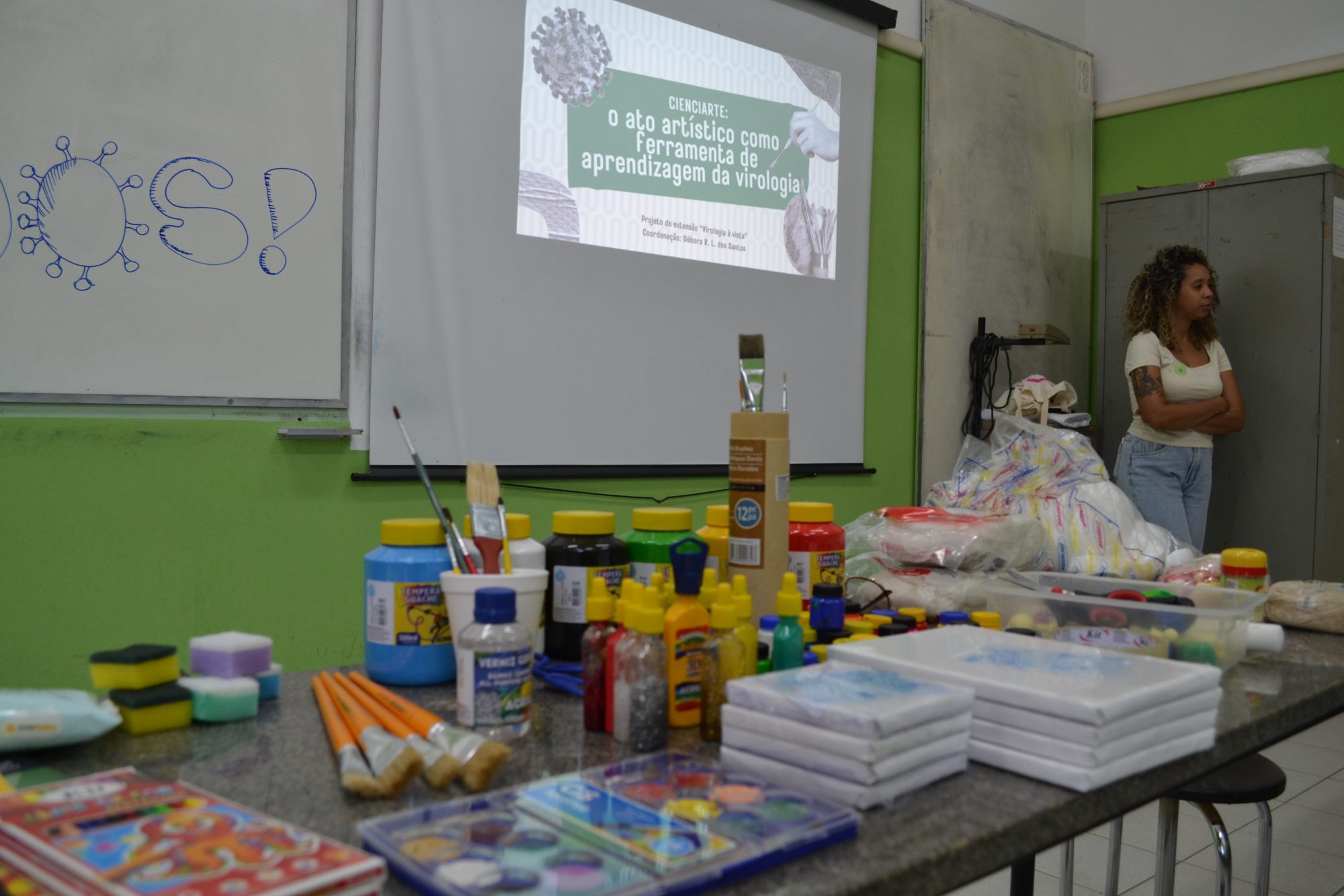 “De um modo geral, o projeto une arte e ciência com a finalidade de educação e com uma metodologia didática. É um projeto multidisciplinar, onde os integrantes de cada área são igualmente importantes para colaborar com o desenvolvimento do conhecimento”, disse Debora Lopes dos Santos, professora do Instituto de Veterinária e coordenadora do “Virologia à Vista”, que ministrou a oficina junto com a equipe do projeto.