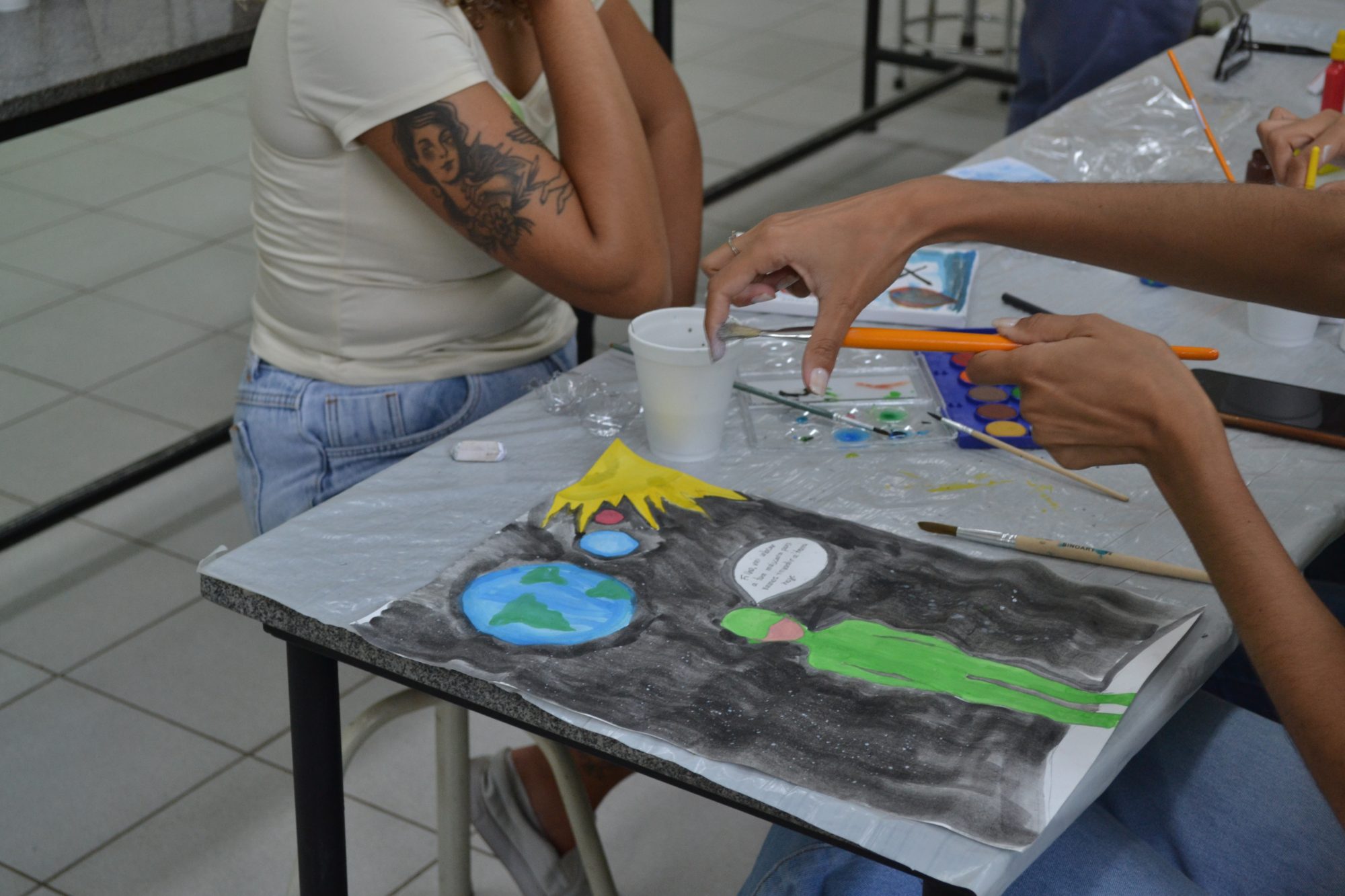 “Achei muito diferente. Foi uma experiência legal porque eles desenvolveram um assunto interdisciplinar, que envolveu arte, ciência e métodos de prevenção. Foi muito além do que eu imaginava”, destacou Emily Ferreira, discente de Biologia, que participou da oficina e fez uma ilustração sobre um vírus.