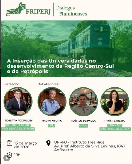 Nesta sexta-feira (13/03), os Diálogos Fluminenses do Fórum de Reitores das Instituições Públicas de Ensino do Estado do Rio de Janeiro (FRIPERJ) terão sede no Instituto Três Rios, da Universidade Federal Rural do Rio de Janeiro, para um debate sobre a inserção das Universidades no desenvolvimento da região Centro-Sul Fluminense e de Petrópolis.