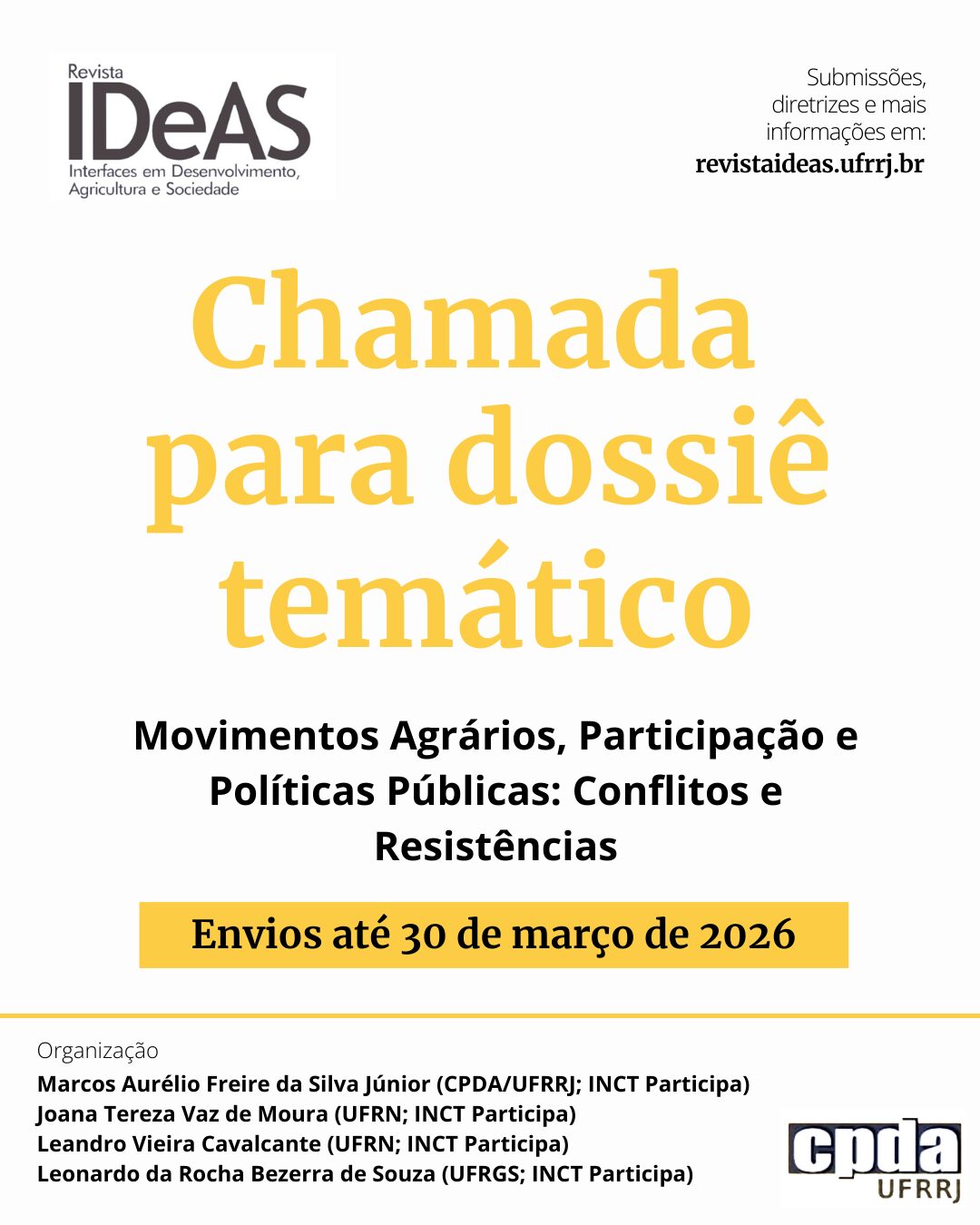A Revista IDeAS, do Programa de Pós-Graduação de Ciências Sociais em Desenvolvimento, Agricultura e Sociedade (CPDA/UFRRJ), está com chamada aberta para o dossiê temático “Movimentos Agrários, Participação e Políticas Públicas: Conflitos e Resistências”.