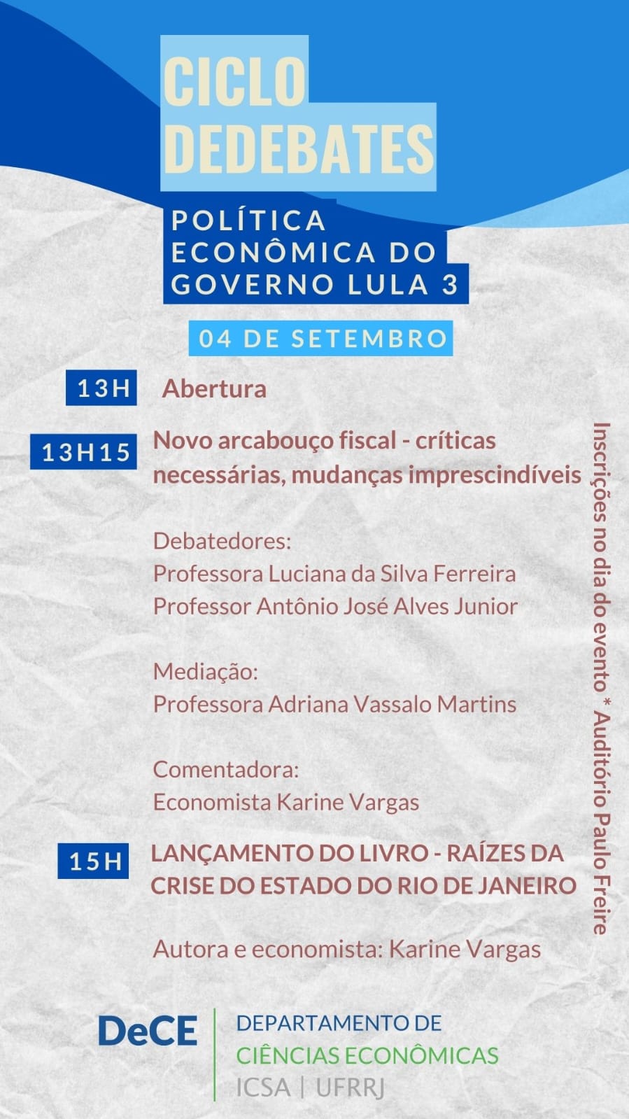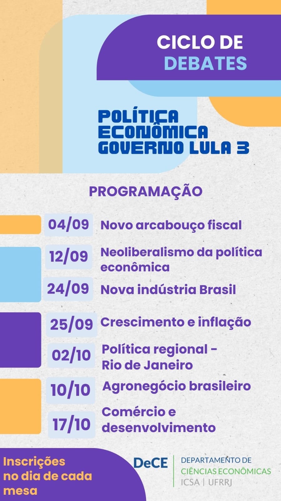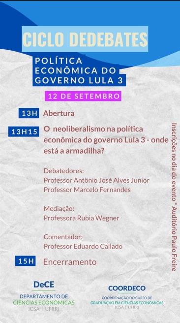 O Departamento de Ciências Econômicas (ICSA/UFRRJ) e a coordenação do curso promovem um ciclo de debates sobre a política econômica do governo Lula, com início nesta quarta-feira, 4/9 (detalhes nos cards).
