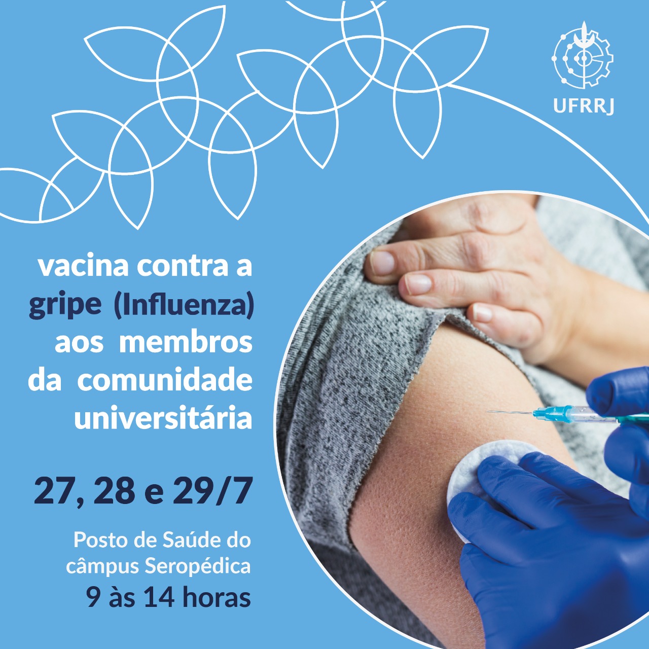 A UFRRJ, em parceira com a Secretaria de Saúde de Seropédica, aplicará a vacina contra a gripe (Influenza) a estudantes, servidores e funcionários terceirizados no Posto de Saúde da Universidade, nos dias 27, 28 e 29 de julho, de 9 às 14 horas.