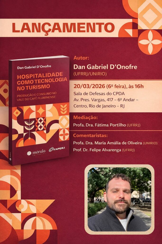 Na próxima sexta-feira, dia 20/3, às 16 horas, acontecerá o lançamento do livro Hospitalidade como tecnologia no turismo – Produção e consumo no Vale do Café fluminense, de autoria de Dan Gabriel D’Onofre, professor do Departamento de Hotelaria e Serviço Social da Universidade Federal Rural do Rio de Janeiro (UFRRJ).