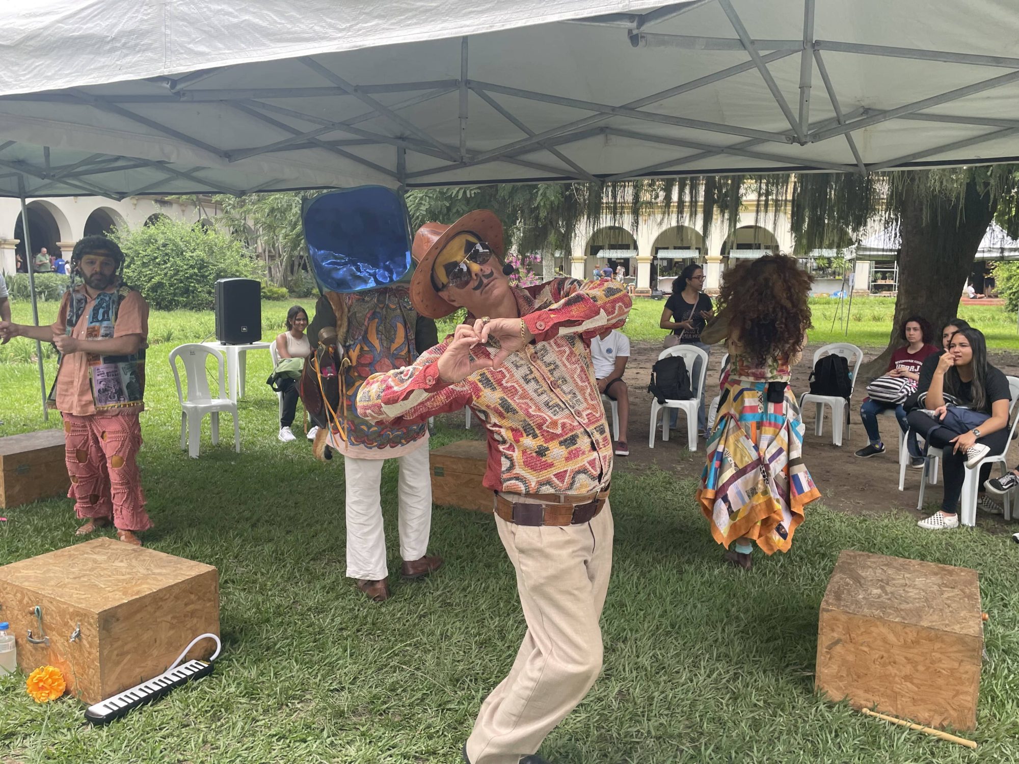 A canção do cantor e compositor Riachão abre a peça teatral “O Rapaz da Rabeca e a Moça Rebeca” que, além dessa, faz muitas outras referências à música popular brasileira. Produzido pelo Museu da Vida da Fundação Oswaldo Cruz (Fiocruz), o show trouxe toda a sua irreverência e bugigangas coloridas para o jardim do Pavilhão Central (P1), câmpus Seropédica, na quarta-feira (18/10). A obra é inspirada no cordel de José Mapurunga e visa conscientizar o público sobre a Aids e a importância do uso da camisinha.