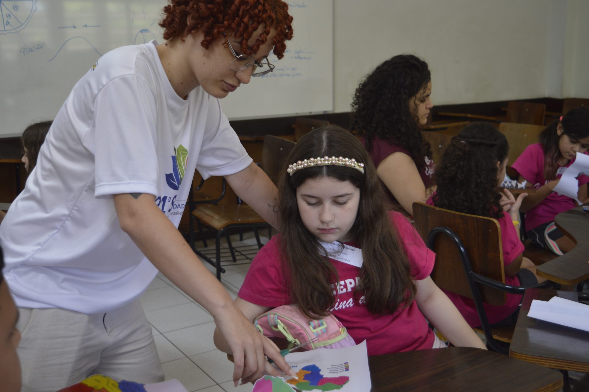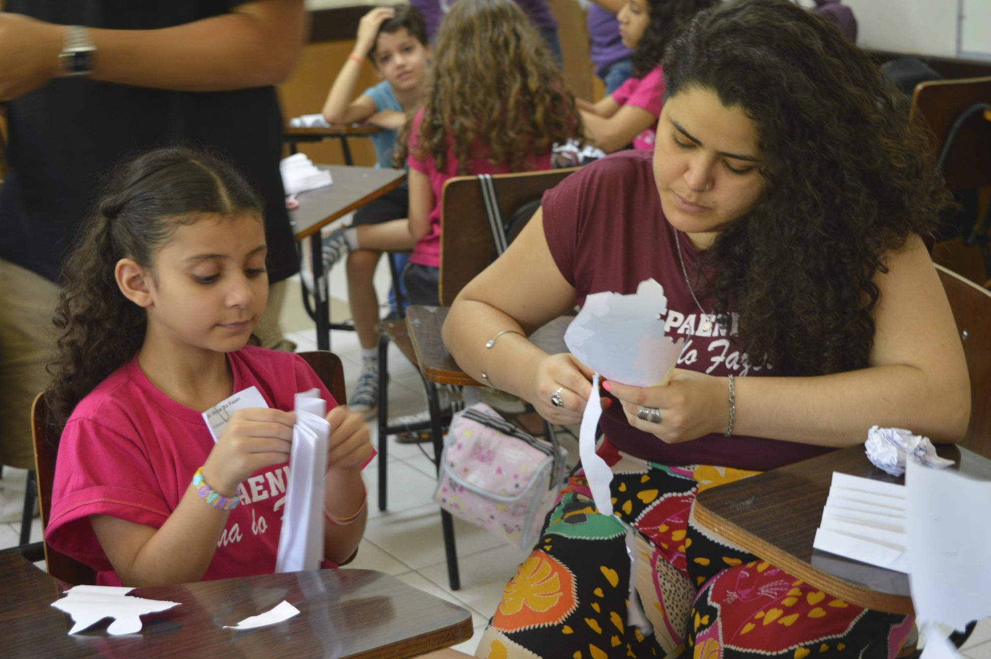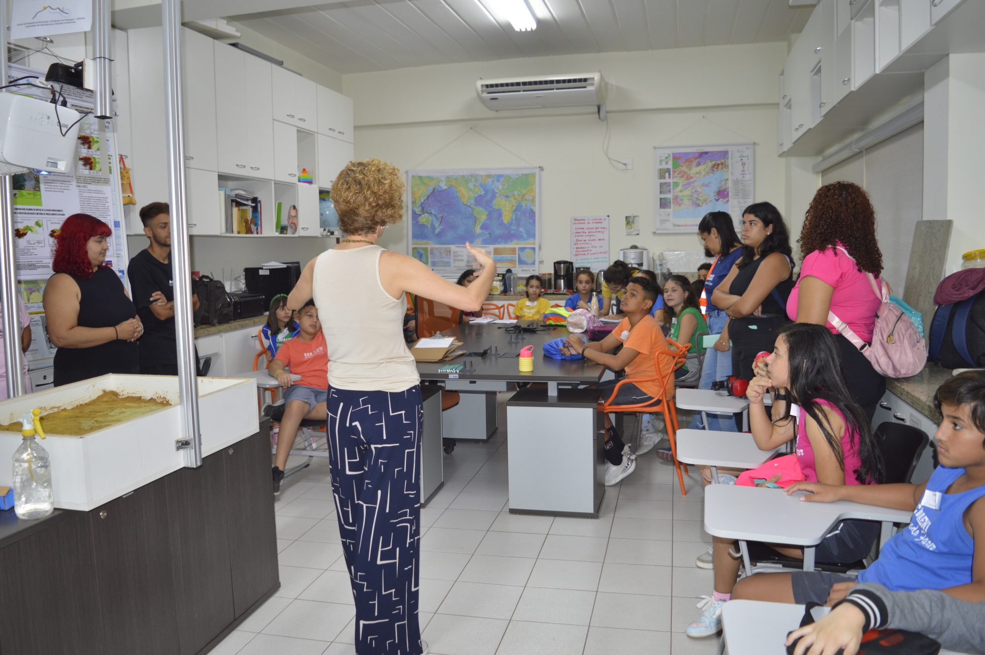 Em outra sala, os alunos do 3º e 4º ano do CEPAENI – Oficina do Fazer estavam concentrados nas atividades de recorte propostas na oficina Dinâmica dos Continentes, sob o olhar atento de suas professoras e da coordenadora pedagógica Marizete Dias Barros. “Vimos o anúncio e achamos que seria interessante trazer os alunos para participarem das atividades e conhecerem o ambiente acadêmico que, afinal de contas, é da cidade deles, mas eles não têm muita oportunidade de conhecer. Também é importante para as crianças verem os universitários envolvidos, trabalhando. É uma forma de motivá-los a um dia também estarem estudando aqui”, compartilhou Marizete.
