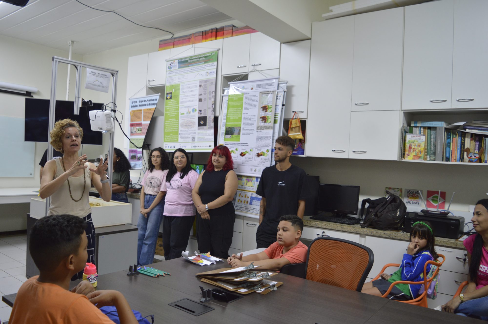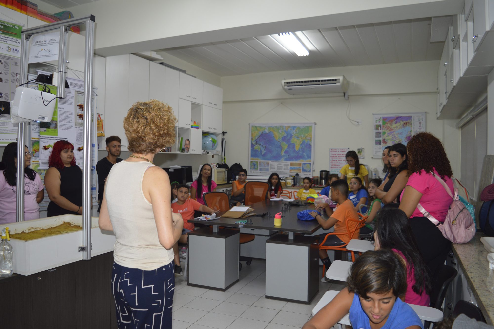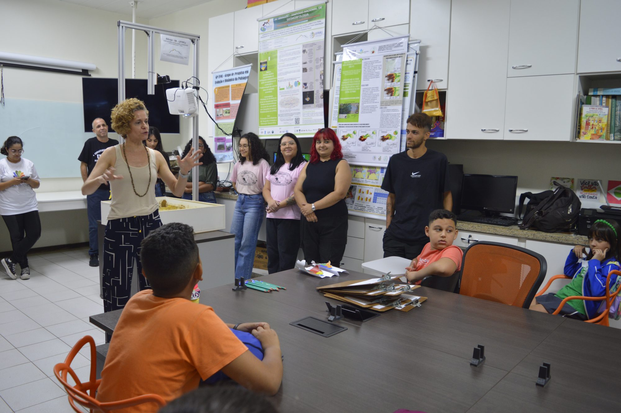 Enquanto isso, a turma do 5º ano já estava envolvida em outra discussão científica. Agora, sobre a ciência do relevo. Laura Delgado Mendes, professora do Departamento de Geografia do Instituto Multidisciplinar (IM/UFRRJ) apresentou para os alunos do Ensino Fundamental a caixa de areia de realidade aumentada. A ação integra o projeto de extensão universitária coordenado pela docente e contribui para popularizar os conhecimentos científicos sobre geomorfologia. “A partir da caixa de areia, conseguimos discutir uma série de assuntos ligados à transformação da paisagem, como o papel da água na dinâmica do relevo”, explica Laura, que complementa: “Educar sobre esse tema é fundamental, principalmente no contexto que vivemos hoje de mudanças climáticas”.