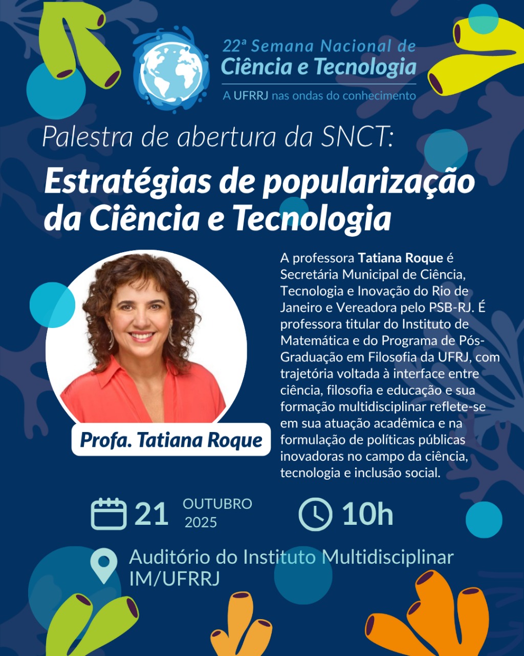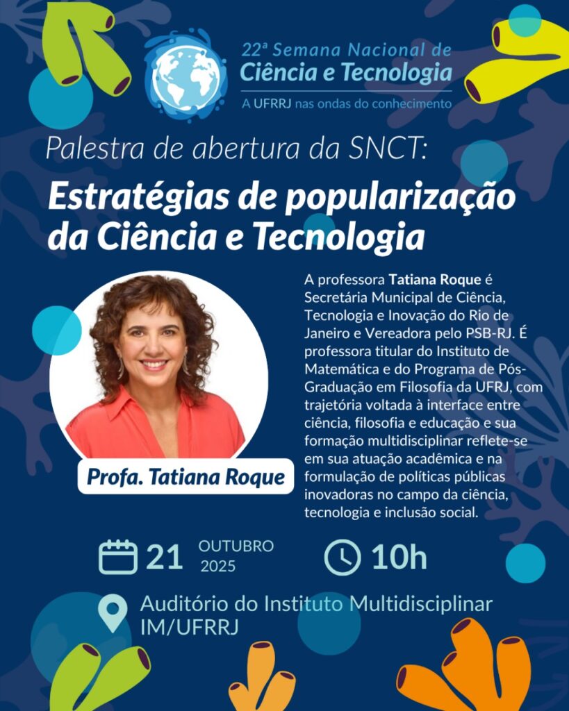 A abertura oficial da SNCT 2025 acontecerá no dia 21/10, às 10 horas, no Auditório Profº Bruno Rodrigues de Almeida, situado no Bloco Multimídia do Instituto Multidisciplinar (IM), câmpus Nova Iguaçu, e será transmitida na conta oficial da Universidade no YouTube.