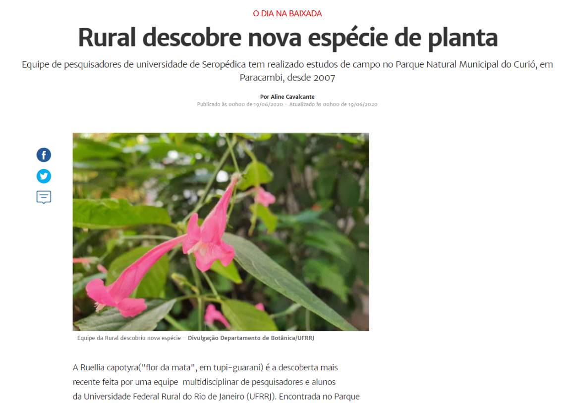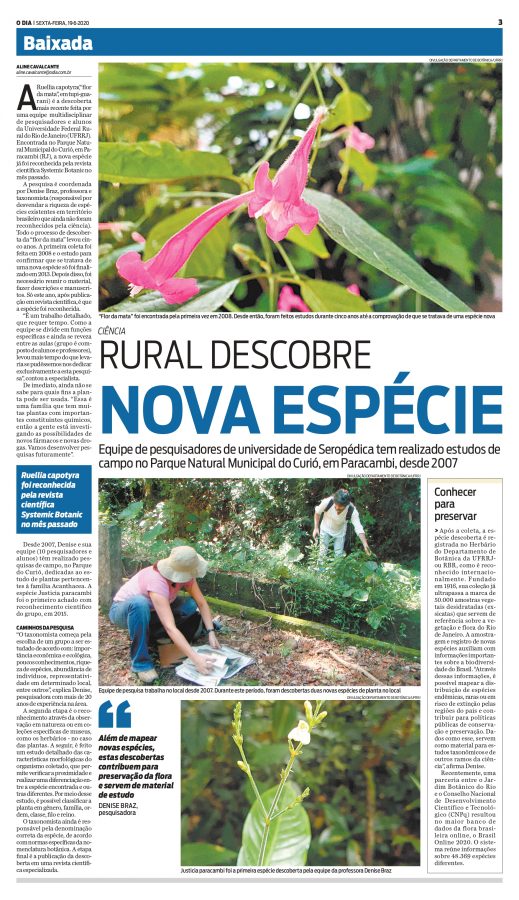 Reportagem do jornal O Dia publicada na sexta, dia 19/6, repercute a descoberta realizada por equipe de pesquisadores da UFRRJ no Parque Natural Municipal do Curió, em Paracambi.