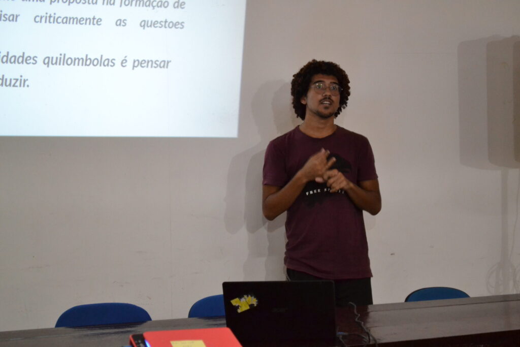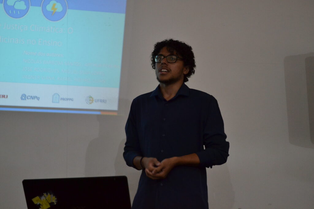 O aluno de Ciências Agrárias, Arthur Pereira, apresentou o tema “Mudanças Climáticas e Educação Ambiental”. Ele destacou como os conhecimentos quilombolas podem ser usados como ferramenta pedagógica na Baixada Fluminense. Inspirado nas ideias de Antônio Bispo dos Santos, especialmente o princípio “a terra deu e a terra quer”, Arthur explicou sua atividade em Nova Iguaçu, que busca resgatar a memória, valorizar saberes tradicionais e relacioná-los aos impactos das mudanças climáticas. Sua metodologia é baseada em perguntas que provocam reflexão, conectando vida, memória e aprendizado quilombola à compreensão do meio ambiente na atualidade.