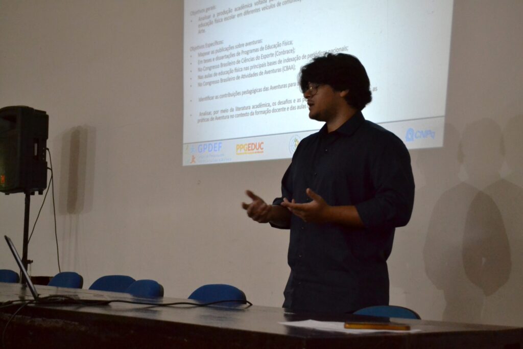 O terceiro palestrante foi Victor Ferreira, estudante do sétimo período de Educação Física. Ele apresentou uma proposta de práticas de aventura nas aulas, apontando que há lacunas nesse ensino, já que muitas escolas ainda se limitam ao “trio mágico” da área: futebol, basquete e vôlei. Para Victor, atividades como trilhas, praias e dinâmicas ao ar livre permitem trabalhar além dos muros da escola, transformando o ambiente externo em sala de aula e até ressignificando espaços urbanos, como prédios abandonados. Ele destacou também que essas práticas podem funcionar como um escape, tanto da repetição das atividades tradicionais quanto da falta de recursos em algumas escolas. Esse tipo de vivência ainda contribui para desenvolver a consciência corporal dos estudantes.