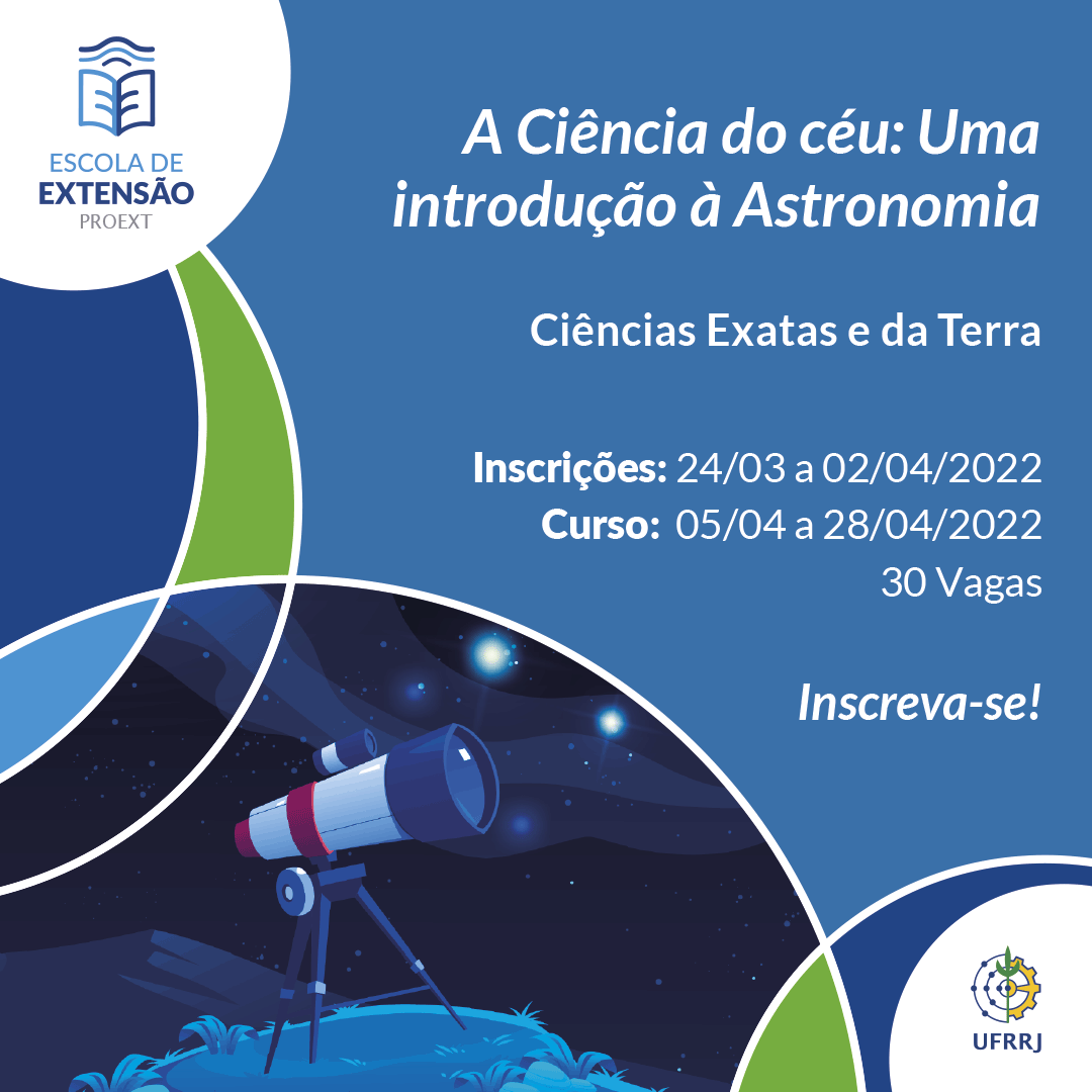 A Escola de Extensão (Eext) da UFRRJ está com três novos cursos disponíveis nas áreas de Ciências Humanas e Ciências Exatas e da Terra, sendo eles: “Inclusão e Pedagogia Hospitalar”, “Fazendo Ciência no Ensino Médio/Técnico” e “A Ciência do céu: Uma introdução à Astronomia”.
