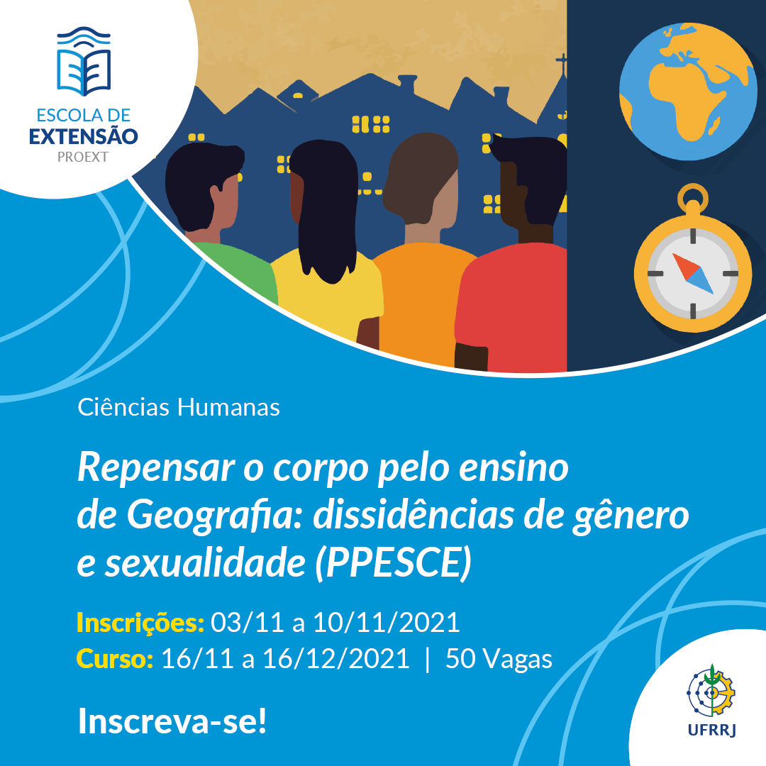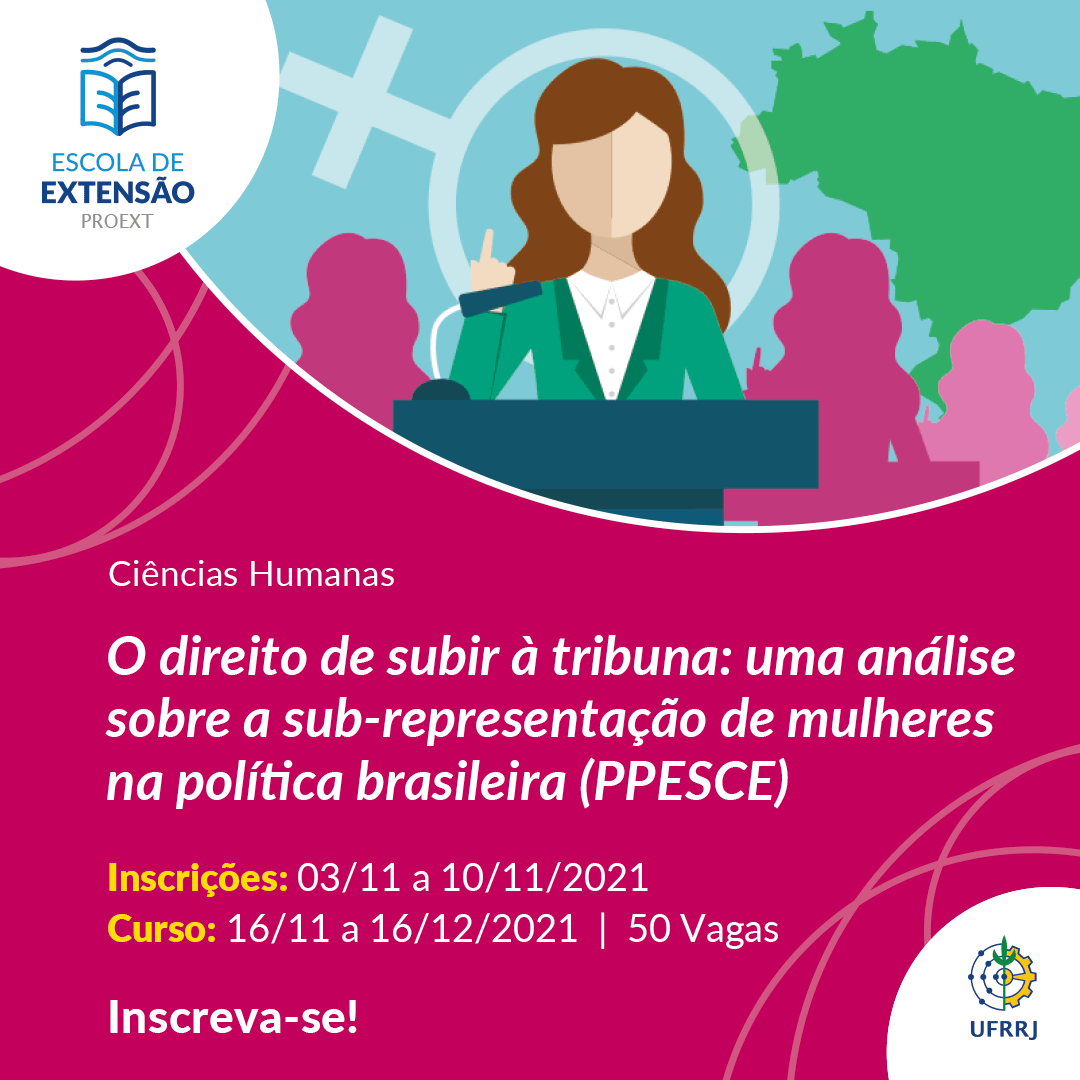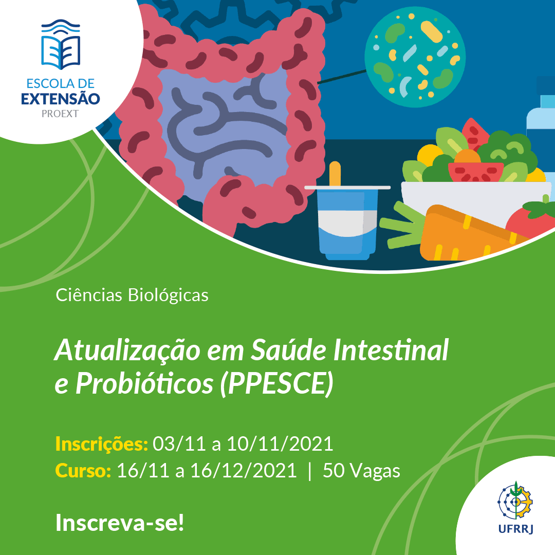 A Escola de Extensão (Eext) da UFRRJ, por meio do Programa de Popularização da Pesquisa Através de Cursos de Extensão (PPESCE), está com oito novos cursos disponíveis nas áreas de Ciências Sociais Aplicadas e Ciências Humanas, sendo eles: “Atualização em Saúde Intestinal e Probióticos”, “O direito de subir à tribuna: Uma análise sobre a sub-representação de mulheres na política brasileira”, “Percursos históricos dos métodos de alfabetização”, “Repensar o corpo pelo ensino de Geografia: Dissidências de gênero e sexualidade”, “História das Religiosidades Afro-Brasileiras no Rio de Janeiro: de 1890 ao século XXI”, “Desenvolvimento Territorial Sustentável e Participação Social: o Território da Baía da Ilha Grande-RJ”, “Como dialogar com um negacionista” e “Direitos Humanos para humanos direitos? A criação dos Direitos Humanos e suas implicações na sociedade”.