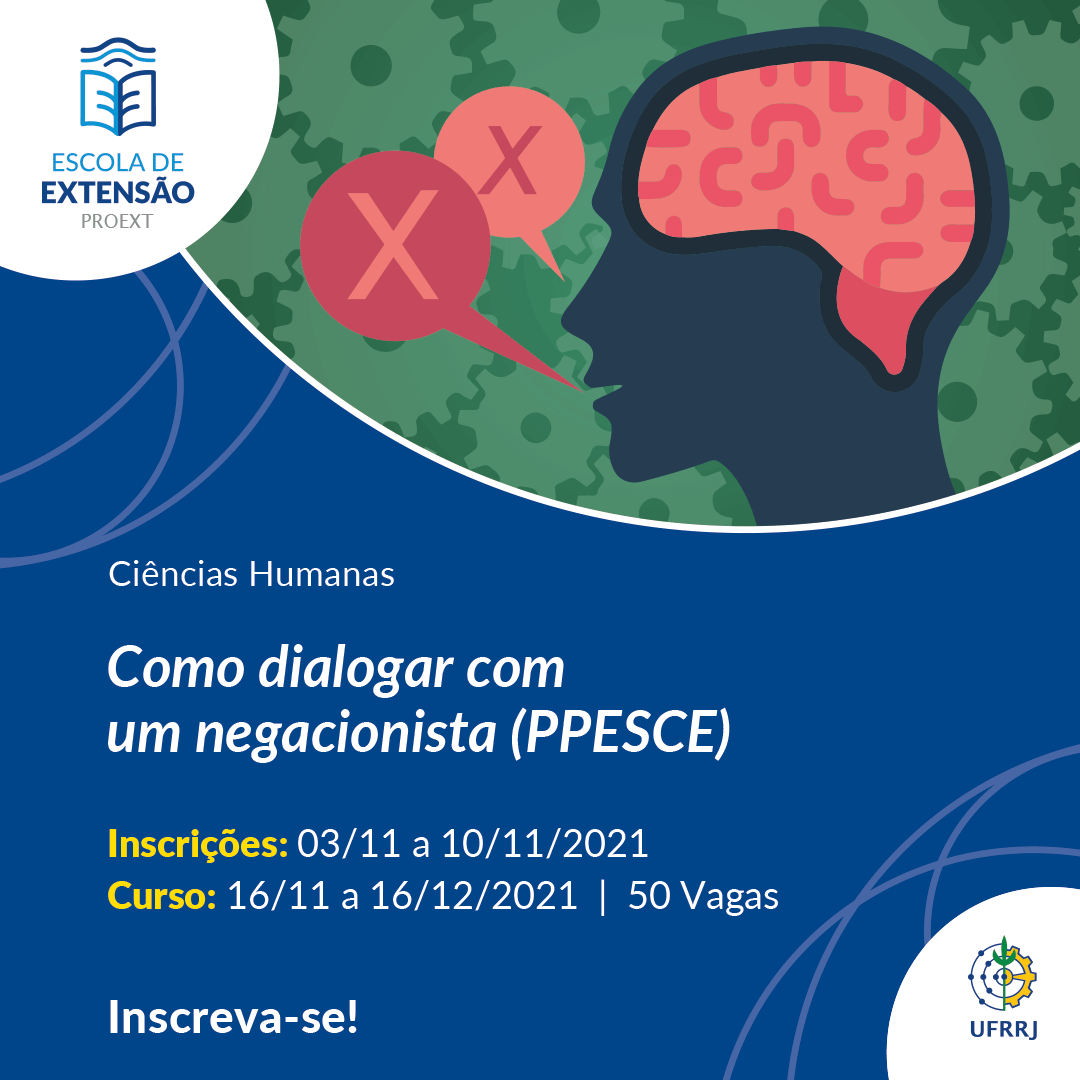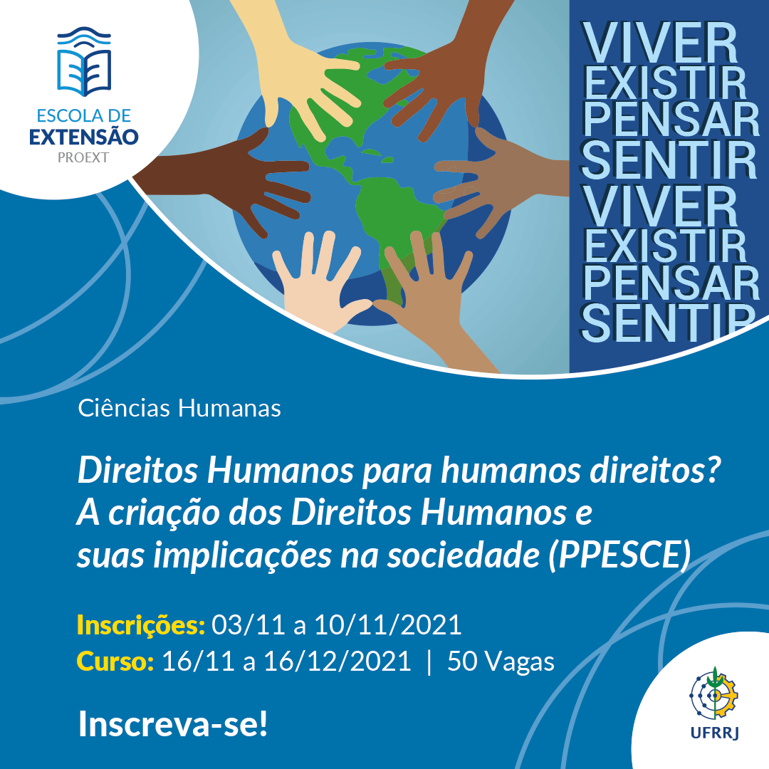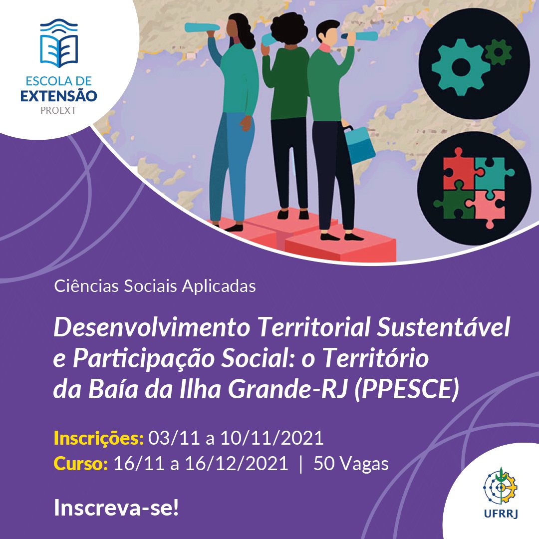A Escola de Extensão (Eext) da UFRRJ, por meio do Programa de Popularização da Pesquisa Através de Cursos de Extensão (PPESCE), está com oito novos cursos disponíveis nas áreas de Ciências Sociais Aplicadas e Ciências Humanas, sendo eles: “Atualização em Saúde Intestinal e Probióticos”, “O direito de subir à tribuna: Uma análise sobre a sub-representação de mulheres na política brasileira”, “Percursos históricos dos métodos de alfabetização”, “Repensar o corpo pelo ensino de Geografia: Dissidências de gênero e sexualidade”, “História das Religiosidades Afro-Brasileiras no Rio de Janeiro: de 1890 ao século XXI”, “Desenvolvimento Territorial Sustentável e Participação Social: o Território da Baía da Ilha Grande-RJ”, “Como dialogar com um negacionista” e “Direitos Humanos para humanos direitos? A criação dos Direitos Humanos e suas implicações na sociedade”.
