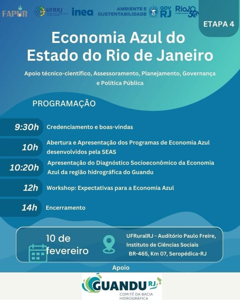 Nesta terça-feira, dia 10 de fevereiro, das 10h às 16h, acontece a oficina “Economia Azul do Estado do Rio de Janeiro: Apoio Técnico-Científico, Planejamento, Mensuração, Governança e Política Pública”, no Auditório Paulo Freire, do Instituto de Ciências Sociais da Universidade Federal Rural do Rio de Janeiro (UFRRJ), câmpus Seropédica.