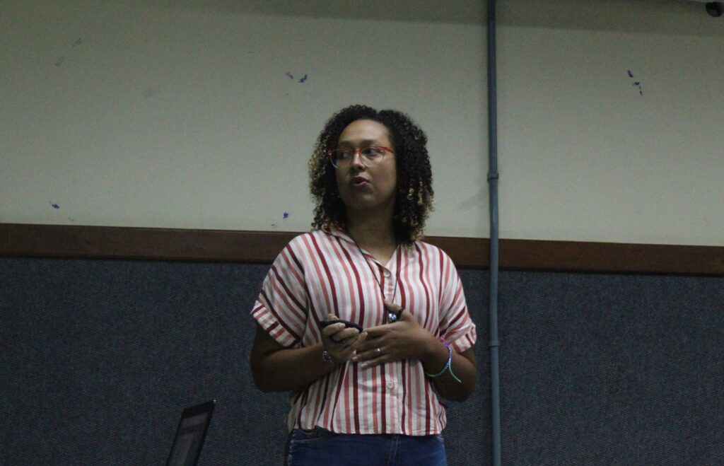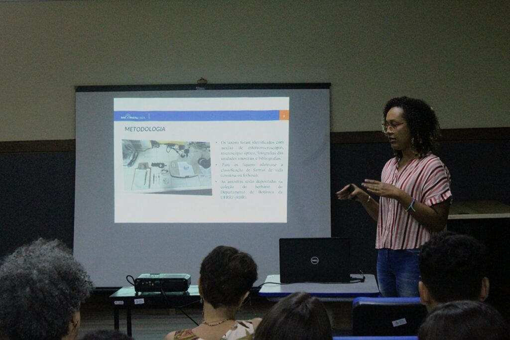A estudante Bianca Maria Dos Santos abordou a pesquisa sobre “Criptógamas fotossintetizantes associadas à coleção de orquídeas do Jardim Botânico da Universidade Federal Rural do Rio de Janeiro” que identificou organismos que formam esporos e gametas escondidos na estufa do jardim botânico da universidade.