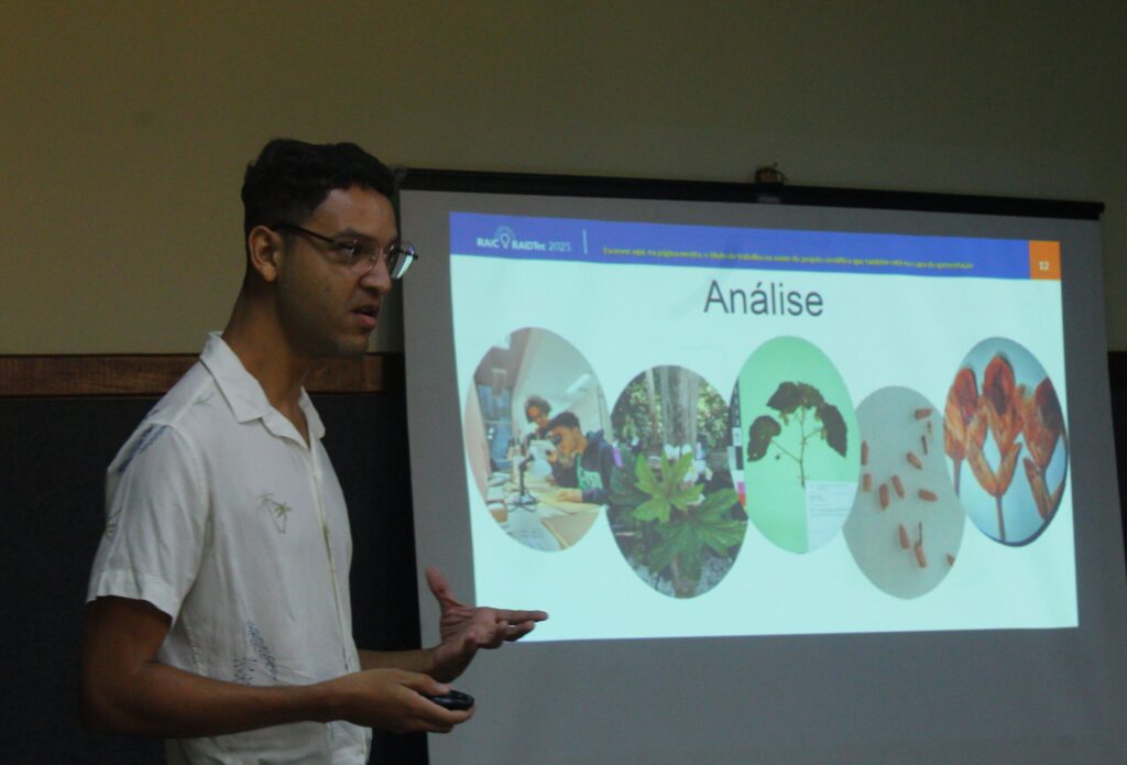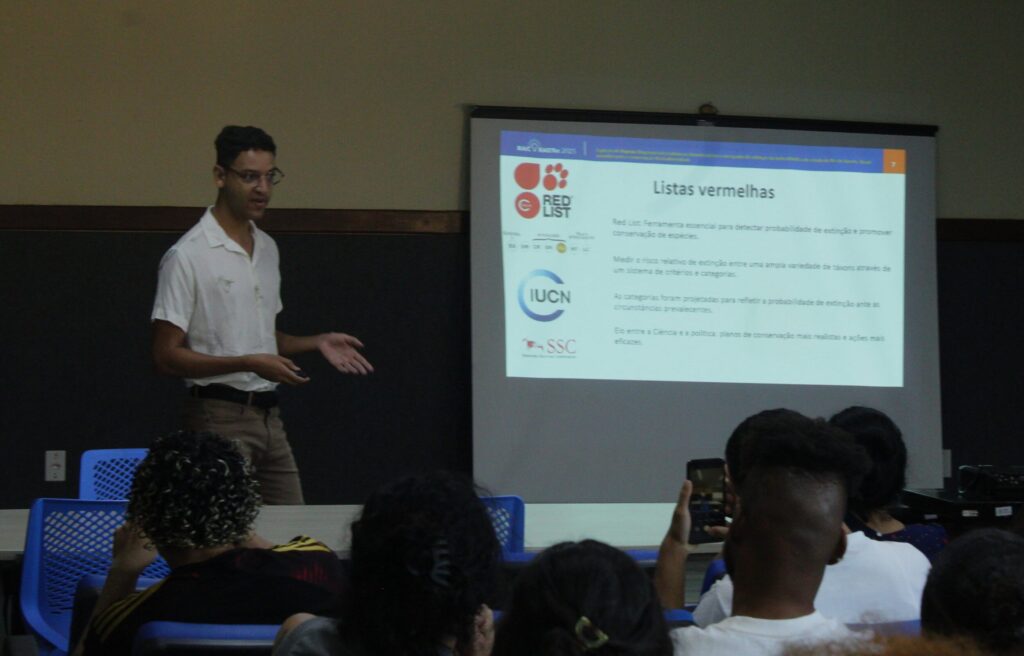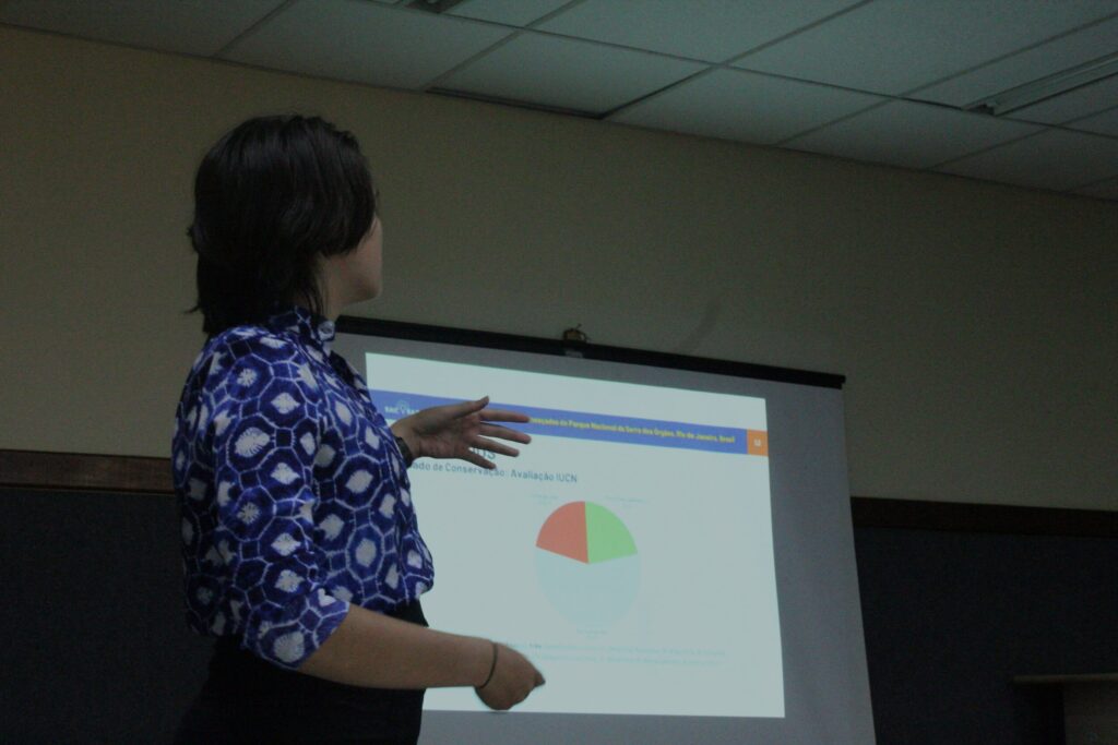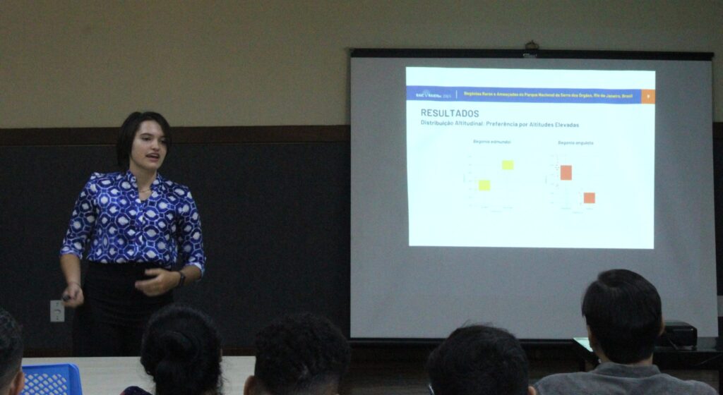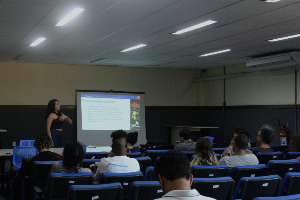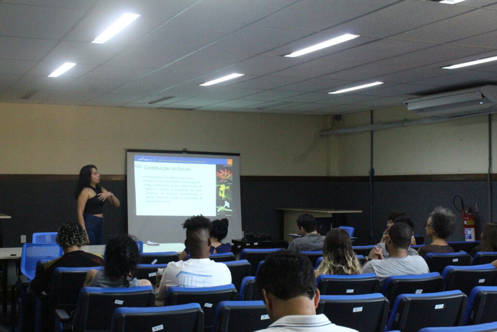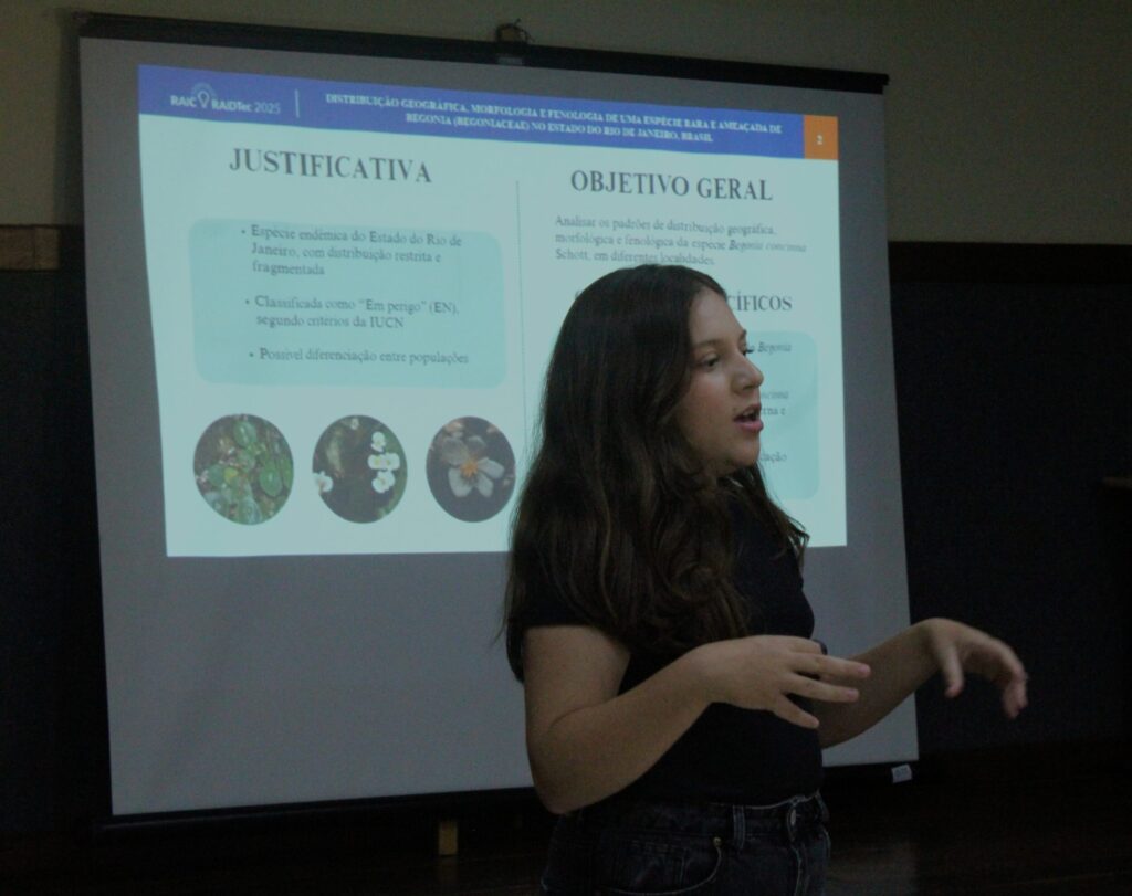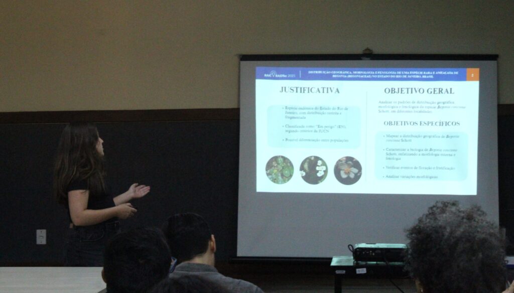 A abertura da sessão de apresentações foi realizada pela aluna de Licenciatura de Ciências Agrícolas, Iasmim Moraes Alves, com a pesquisa “A família Acanthaceae na Mata Atlântica: diversidade e estado de conservação na REBIO Tinguá, RJ”. Ela abordou os desafios do estudo de uma área com ampla ação antrópica. A família Acanthaceae é pouco explorada nessa área de atuação e seu trabalho, que indicou 22 espécies da planta, pretende encaminhar novas pesquisas para a área e gerar políticas públicas de conservação.