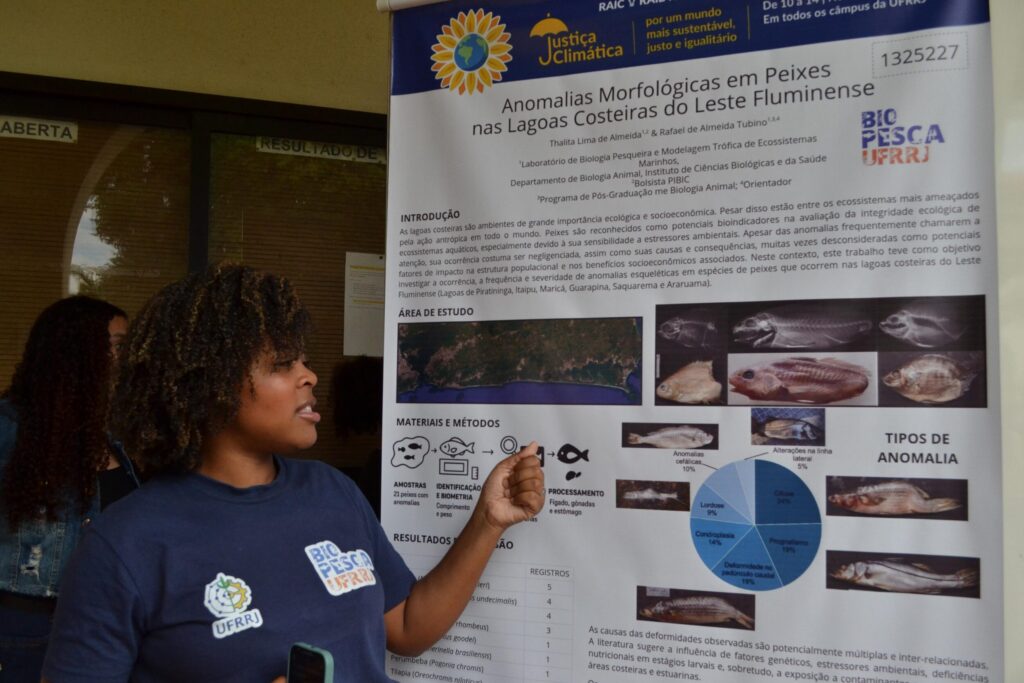 A aluna de Ciências Biológicas, Thalita Lima, apresentou o tema “Anomalias morfológicas em peixes nas lagoas costeiras no leste fluminense”. Thalita descreve que o grande objetivo do projeto é tentar catalogar e identificar qual tipo de malformação esses peixes têm. “Uma característica que esses peixes têm é a tenacidade, pois mesmo com esses tipos de malformações até o dia que eles foram coletados eles estavam lá vivendo”, afirma. Para ela, a grande mensagem do trabalho é “continuar a nadar mesmo com diversidade”, diz e finaliza: “Talvez eles nunca pensassem que iriam chegar em uma universidade pública trazendo ciência pro mundo, então se eles chegaram até aqui, imagina onde nós podemos chegar se não desistirmos”.