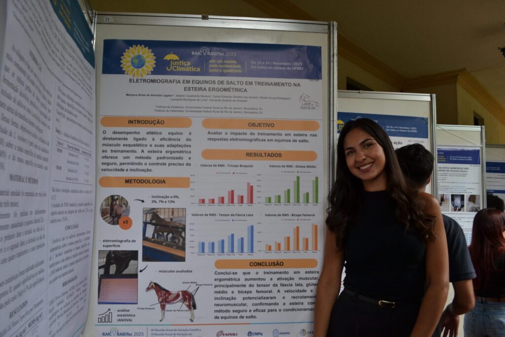 A graduanda em Zootecnia, Maryeva Lagden, mostrou a pesquisa “ Eletromiografia em equinos de salto em treinamento na esteira ergométrica”. O trabalho tem objetivo de avaliar o impacto que o treinamento na esteira tem sobre as respostas eletromiográficas em equinos de salto. Realizado no Laboratório de Avaliação do Desempenho de Equinos, na Escola de Equitação do Exército, em Deodoro, a pesquisa concluiu que esses treinamentos na esteira ergométrica, promoveram a adaptação muscular significativa nesses animais.