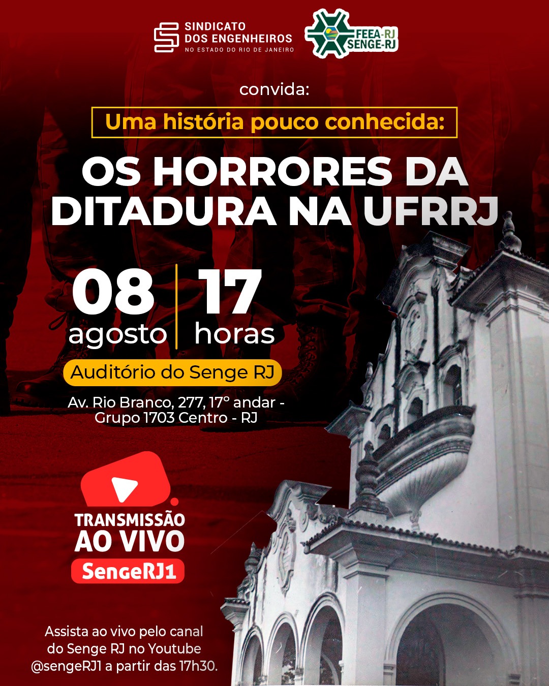 Para aqueles que não puderem comparecer presencialmente, a transmissão ao vivo estará disponível no YouTube do SENGE-RJ a partir das 17h30.