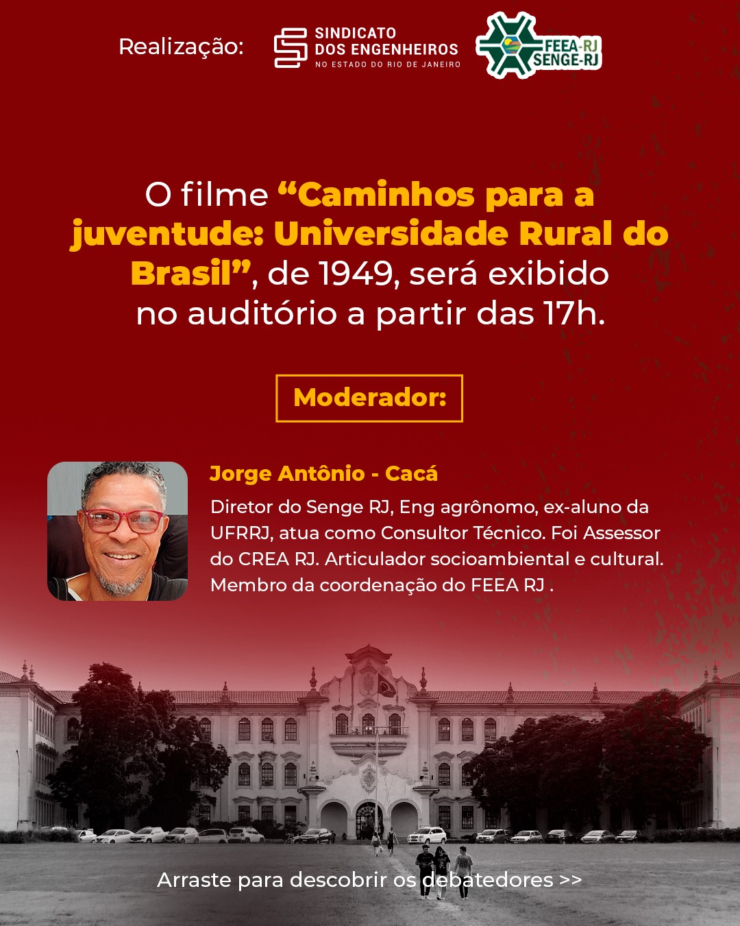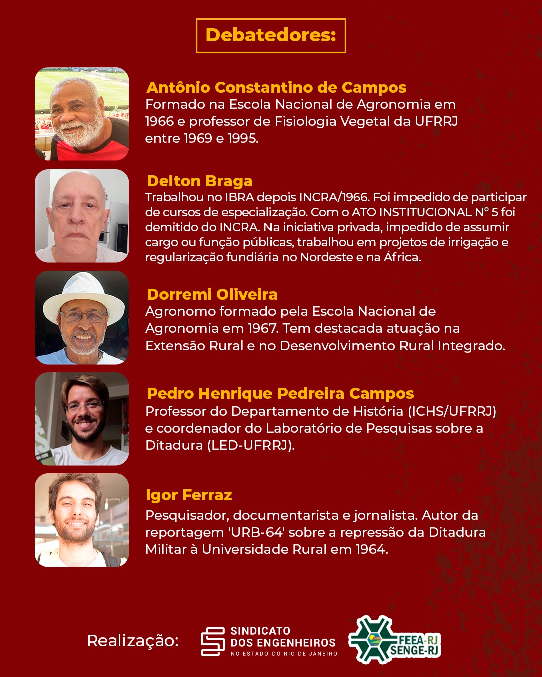 Participarão do debate três engenheiros agrônomos que viveram os acontecimentos em 1964 na Universidade: Delton Braga, formado em 1965, Antônio Constantino de Campos, formado em 1966, e Dorremi Oliveira, formado em 1967. A mediação será de Jorge Antônio Silva, diretor do SENGE-RJ e engenheiro agrônomo pela Rural em 1981.