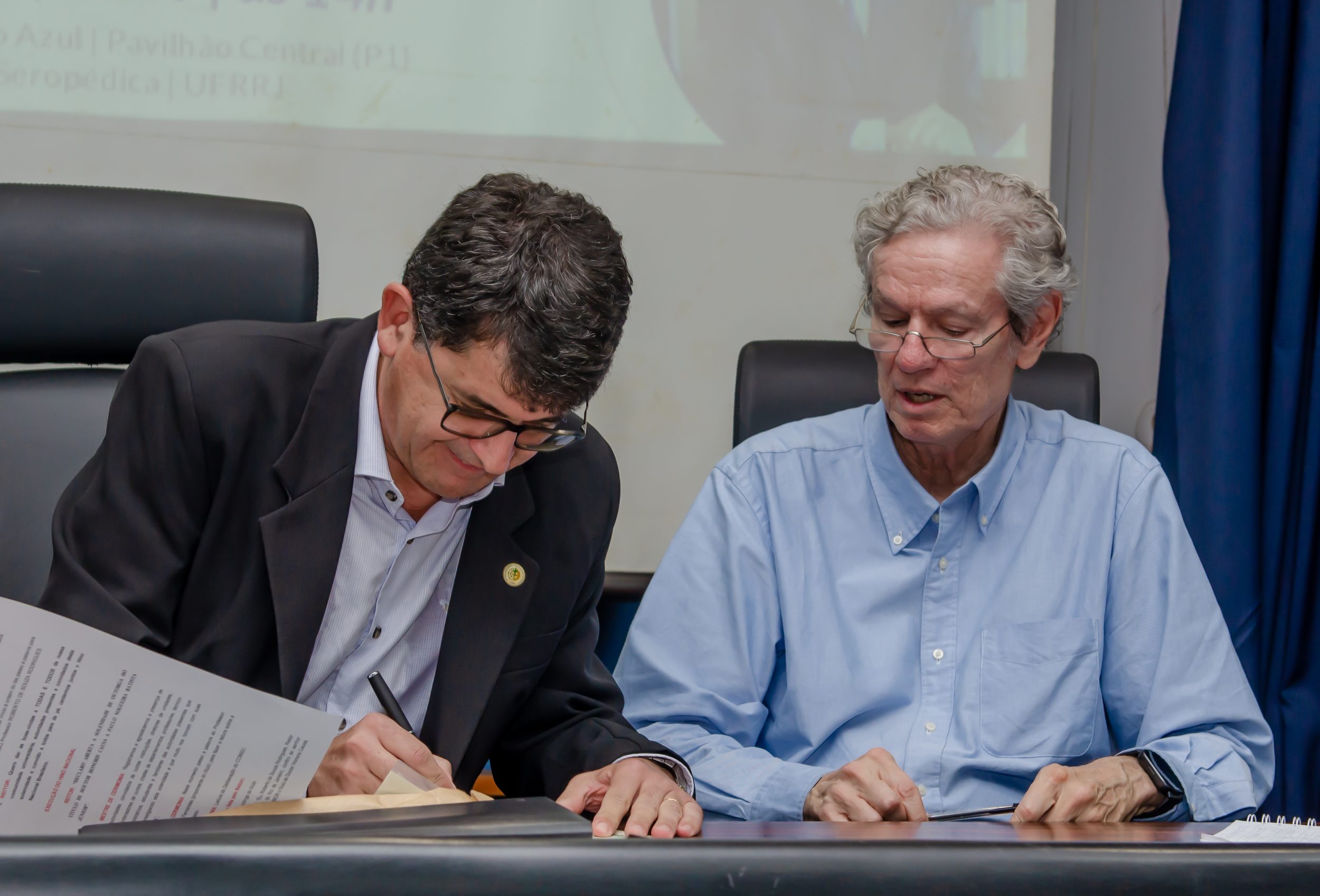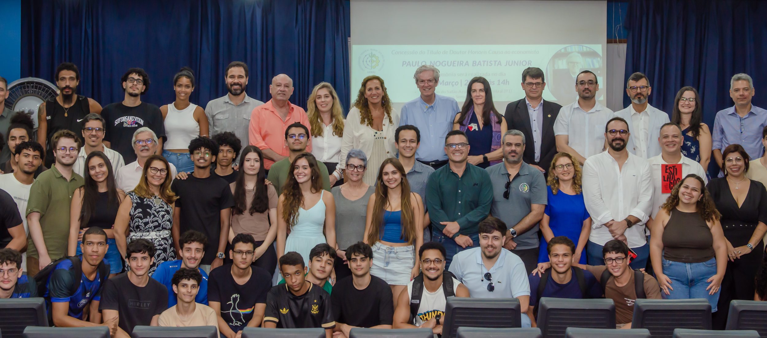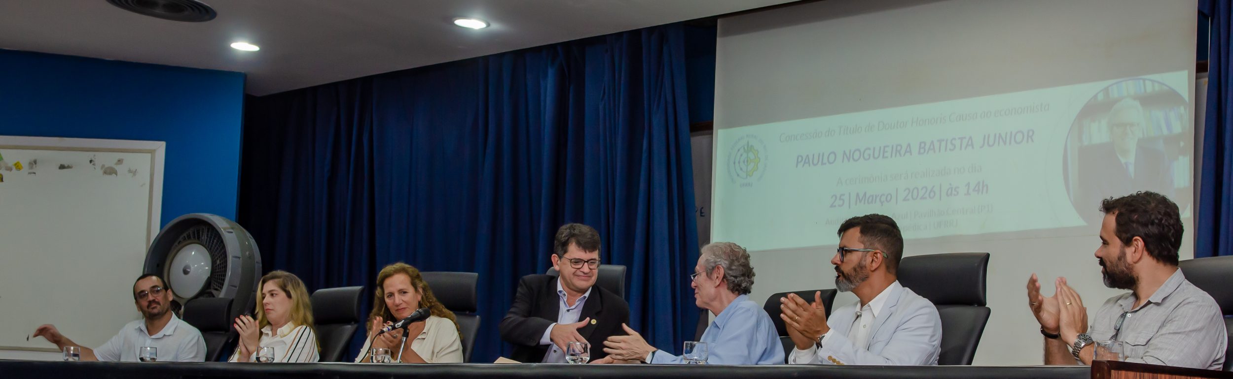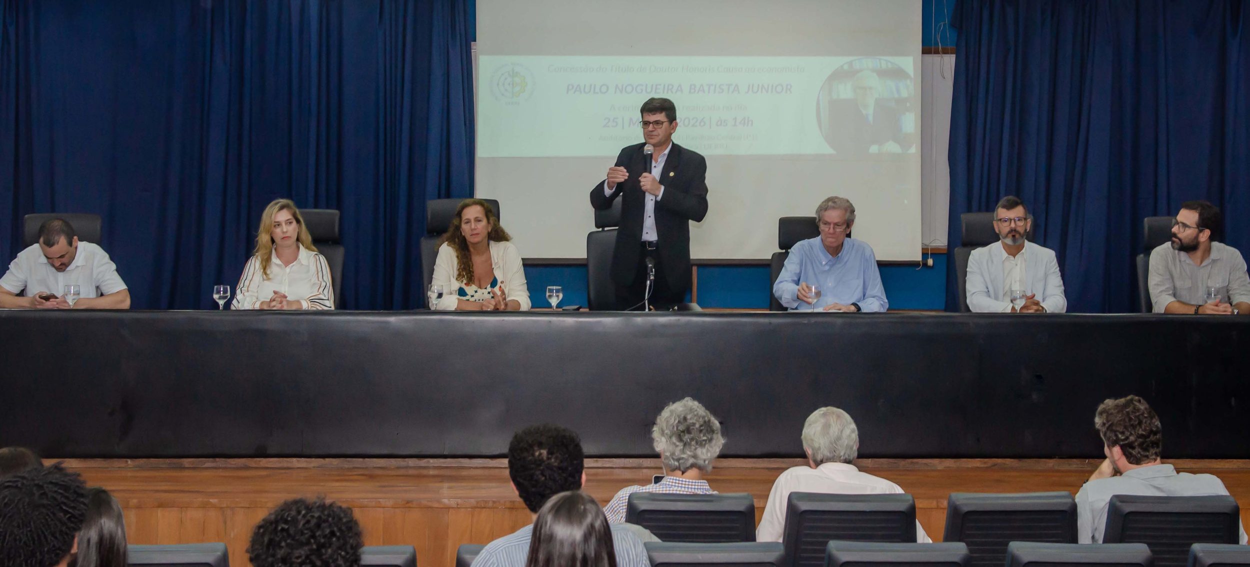 A mesa de cerimônia foi formada pelo reitor Roberto Rodrigues, o pró-reitor adjunto de Pesquisa e Pós-Graduação, Leandro Dias, o diretor do Instituto de Ciências Humanas e Sociais, Rodrigo Santos, a chefe do Departamento de Ciências Econômicas, Rúbia Wegner, a Deputada Federal Jandira Feghali, o professor do Departamento de Ciências Sociais Marcelo Fernandes, e o homenageado Paulo Nogueira Batista Junior. O evento teve início com os agradecimentos e a saudação aos presentes, incluindo os alunos, responsáveis pelos departamentos e institutos, o presidente do Conselho de Economia do Rio de Janeiro, José Antônio Luther Bach, também esteve presente.