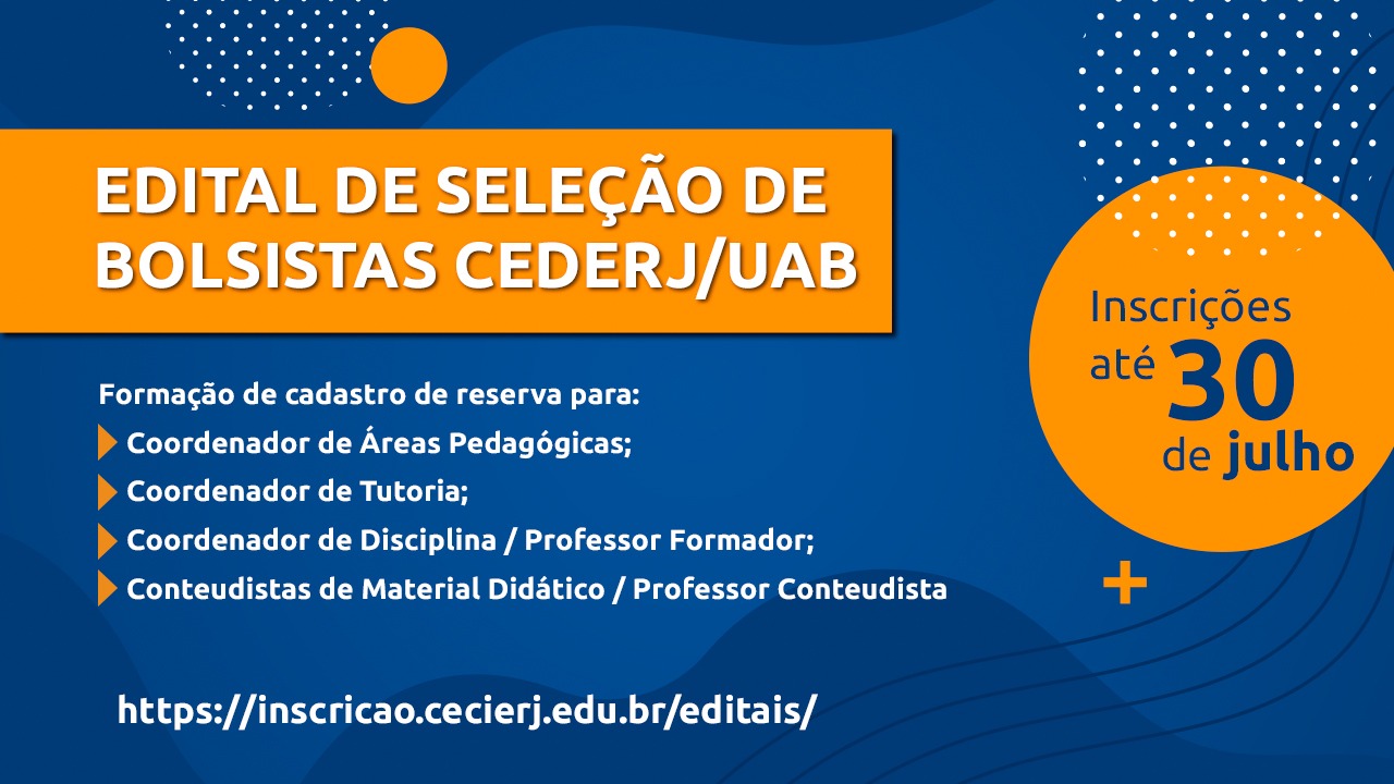 A Fundação Cecierj, juntamente com as coordenações dos cursos de graduação oferecidos no âmbito do Consórcio Cederj, divulgaram edital para seleção de bolsistas. O objetivo é a formação de cadastro reserva para Coordenador de Área, Coordenador de Tutoria; Coordenador de Disciplina /Professor Formador; Conteudistas de material didático / Professor Conteudista.