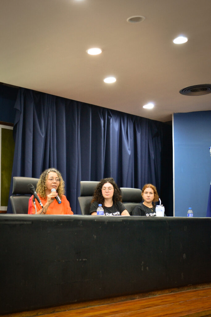 Além da professora Ana Cláudia Peixoto, participaram da mesa os docentes Denis Naiff e Aureliano Lopes, e as representantes do Centro Acadêmico Maria Clara Paiva e Camille Beatriz Lacerda.