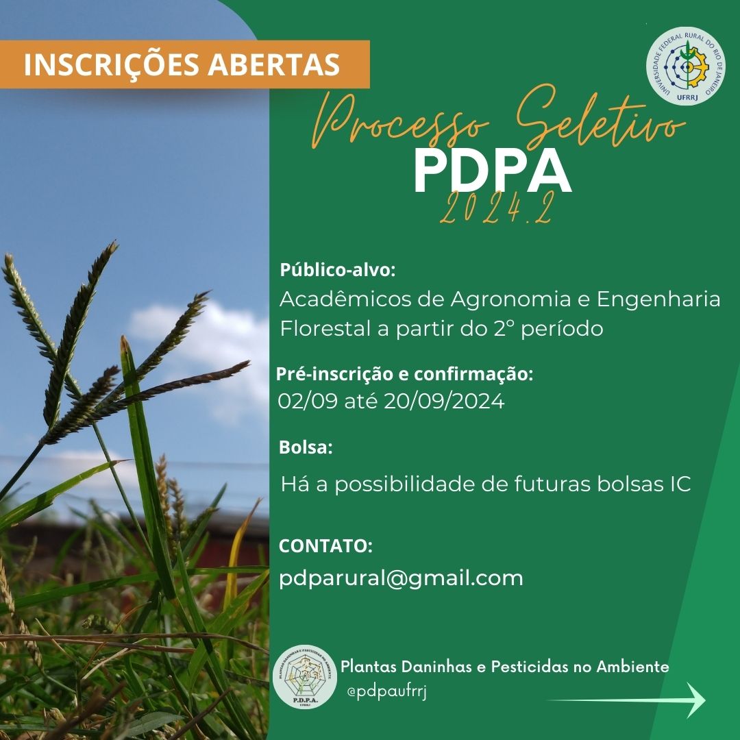 O processo seletivo para o Grupo de Pesquisa Plantas Daninhas e Pesticidas no Ambiente (PDPA) está aberto até o dia 20 de setembro.