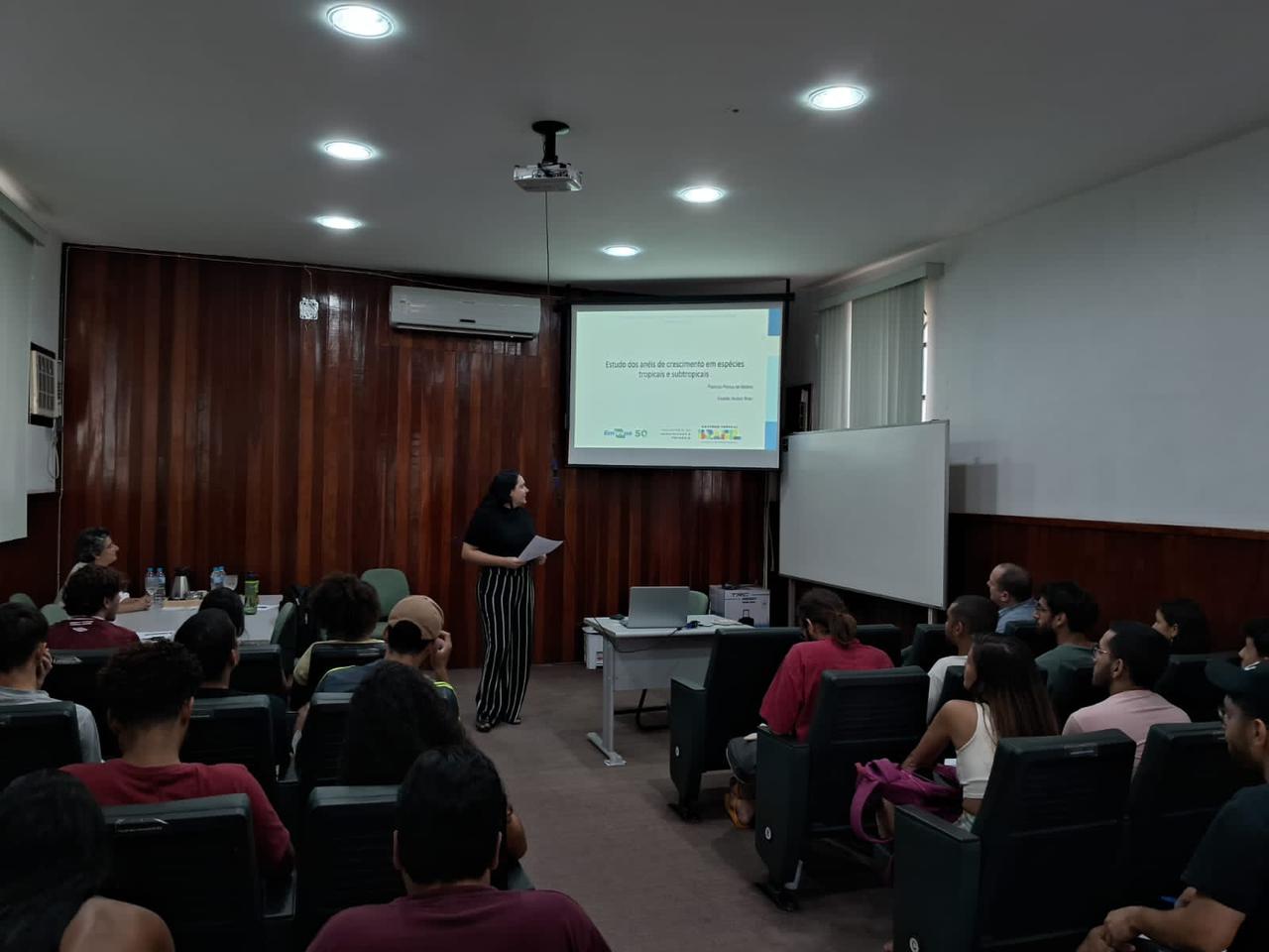 Em seguida, a pesquisadora da Embrapa Florestas, Dra. Patrícia Póvoa de Mattos, egressa da UFRRJ e completando seus 40 anos de formação pela instituição, cativou a audiência com sua palestra intitulada “Estudo dos Anéis de Crescimento em Florestas Tropicais”. Ela apresentou seu amplo domínio nesta área de conhecimento, mostrando que a dendrocronologia é uma vasta área de estudos e tem diversas aplicações, tais como: dendroecologia, dendroclimatologia, dendroarqueologia, dendrohidrologia, dendroentomologia, etc.