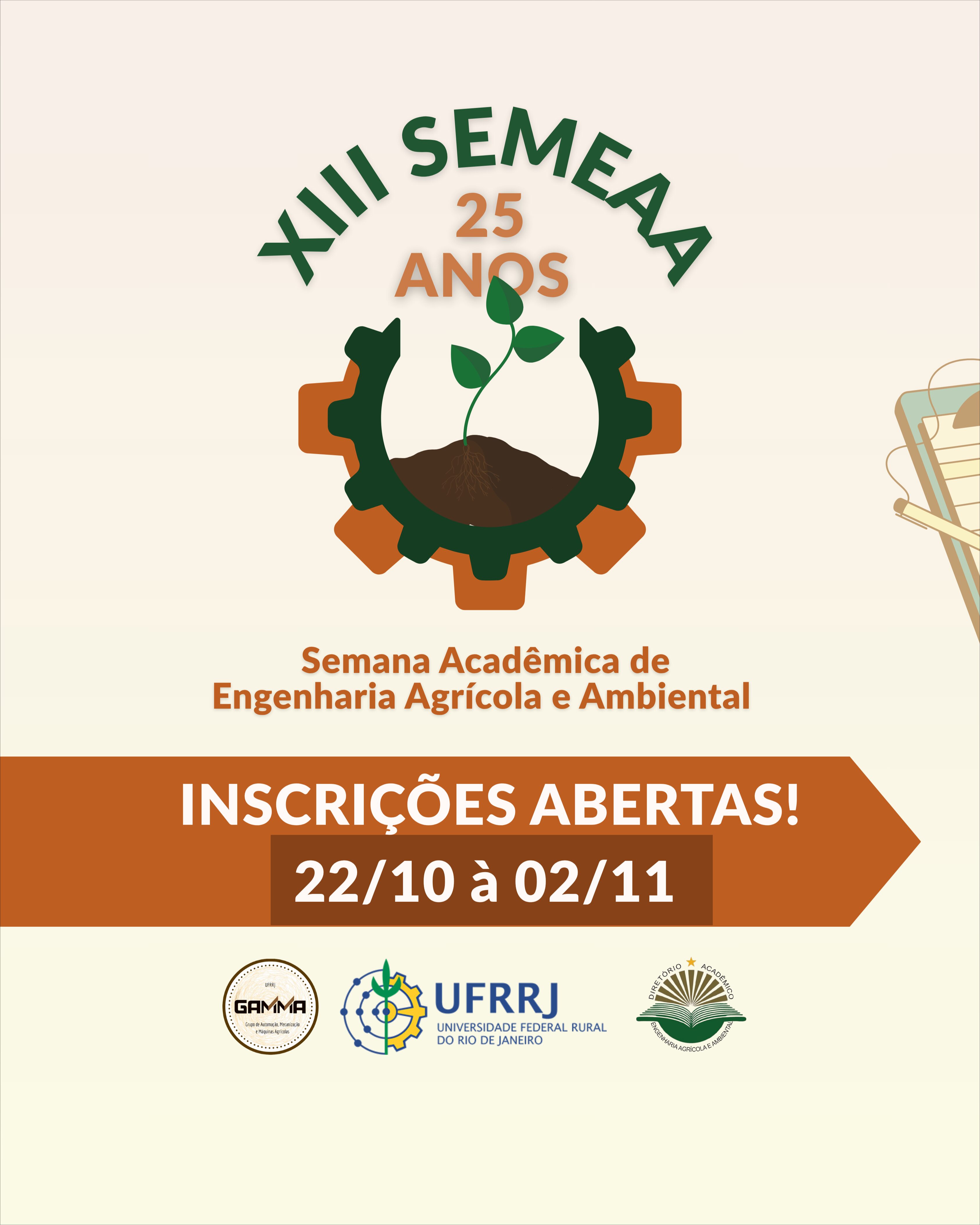 Portal UFRRJ > INSTITUCIONAL > Notícia > Inscrições abertas até 2/11 para a XIII Semana Acadêmica de Engenharia Agrícola e Ambiental