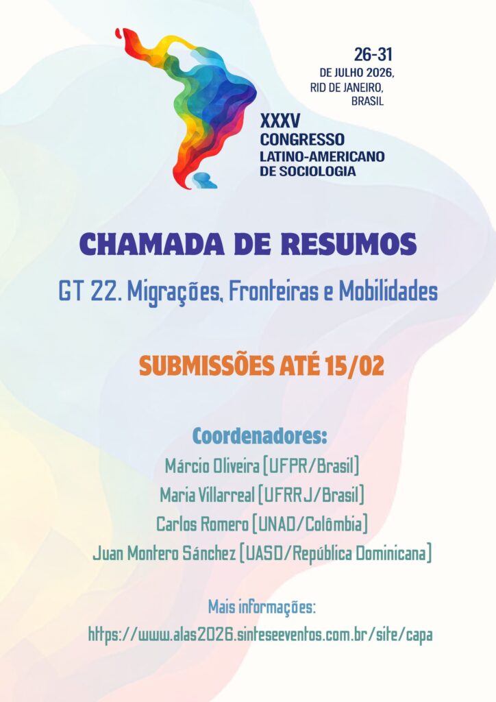 As submissões de resumos para este e os demais GTs podem ser feitas até 15 de fevereiro pelo site: https://alas2026.sinteseeventos.com.br/