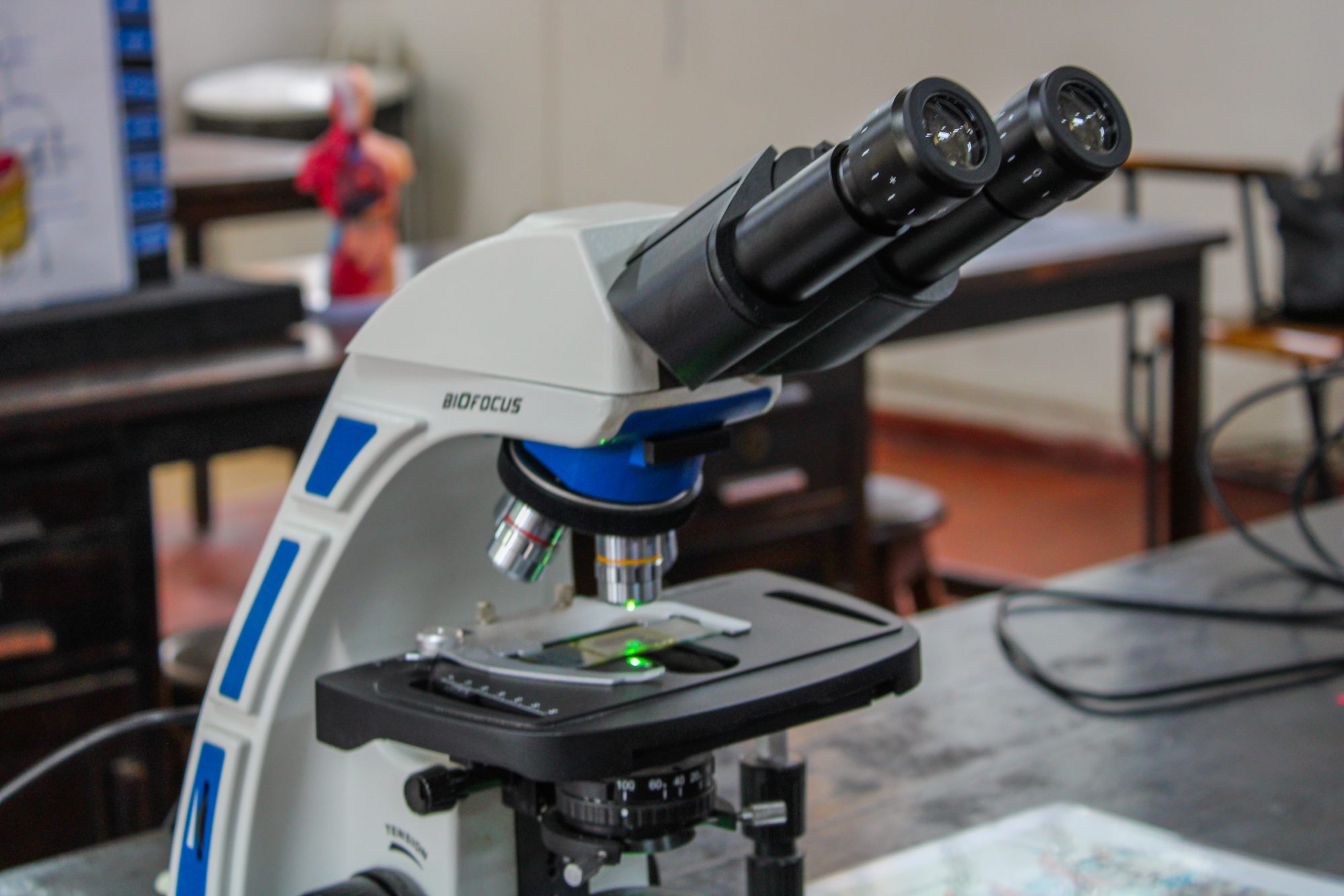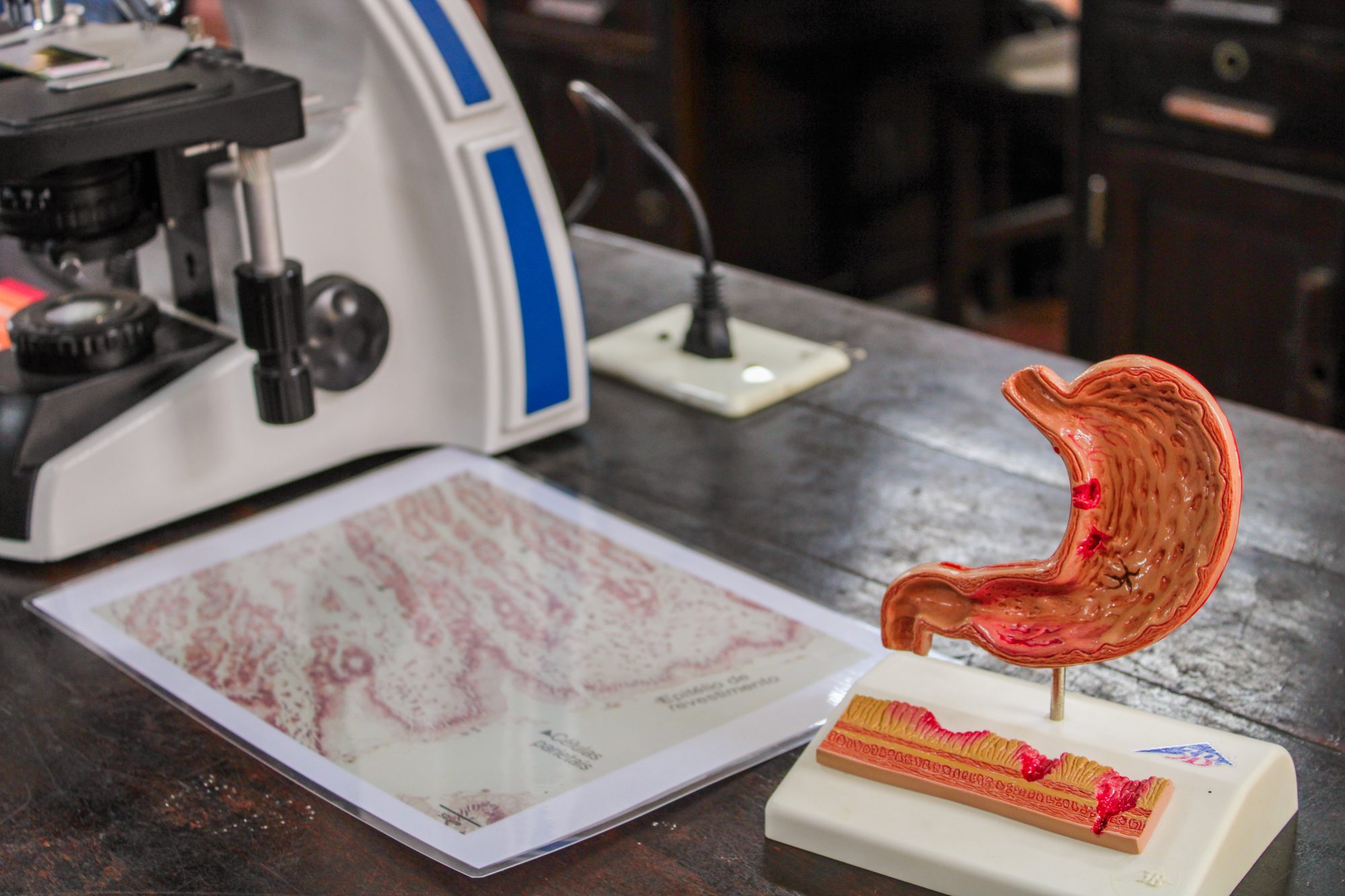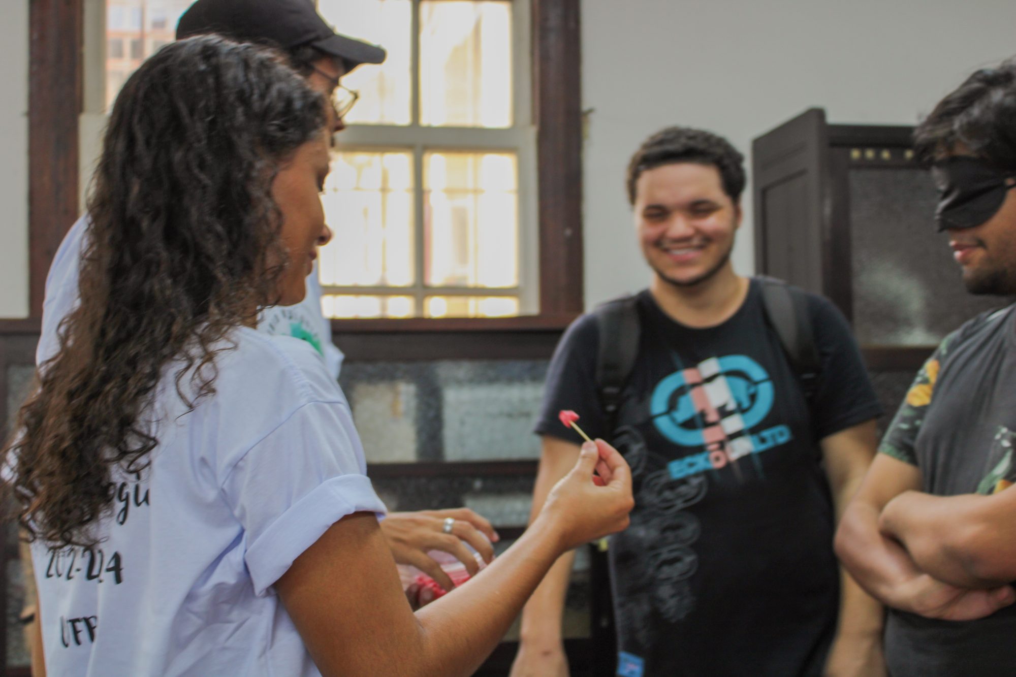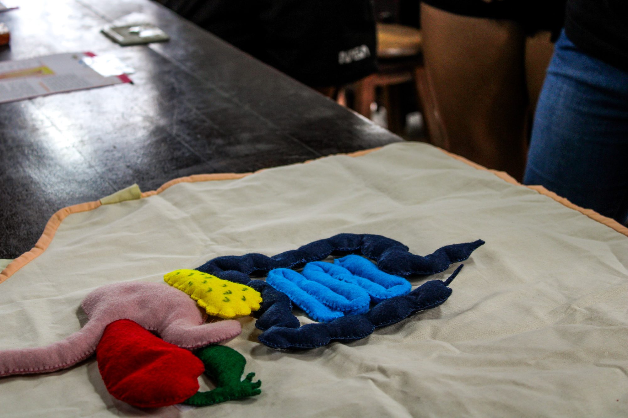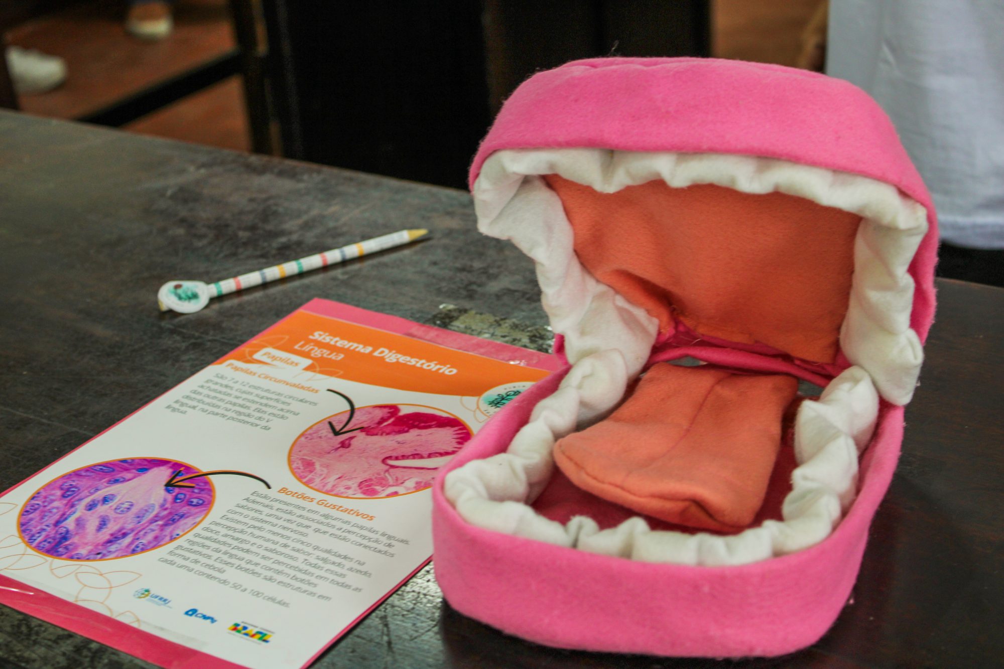 Professores e alunos do Programa Institucional de Bolsa de Iniciação à Docência (Pibid) de Ciências Biológicas realizaram oficinas lúdicas sobre o corpo humano com atividades ilustrativas, assim como fazem nas escolas da região. Na primeira delas, conhecemos o sistema digestório. A bolsista Pibid de Biologia, Letícia Rodrigues, resume o pequeno passeio. “Começamos com uma introdução, falando um pouco do trato digestivo e suas particularidades. Na outra bancada, tem um avental com todos os órgãos e uma boca feitos de feltro. Depois, você pode sentir, vendado, a sensação dos alimentos. Na próxima bancada, há as lâminas do estômago e intestino pelo microscópio. Por último, há um quebra-cabeça para associar as funções”.