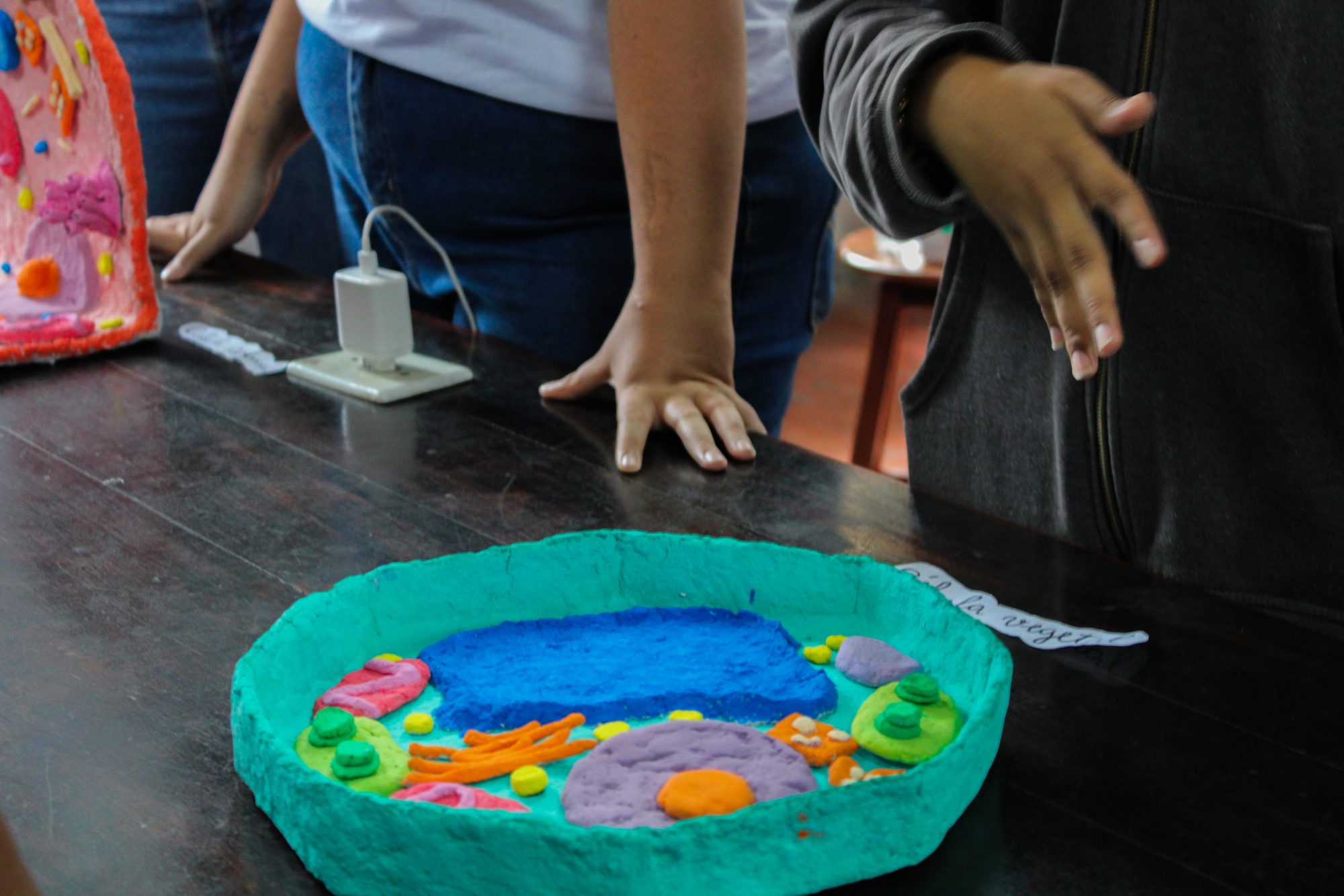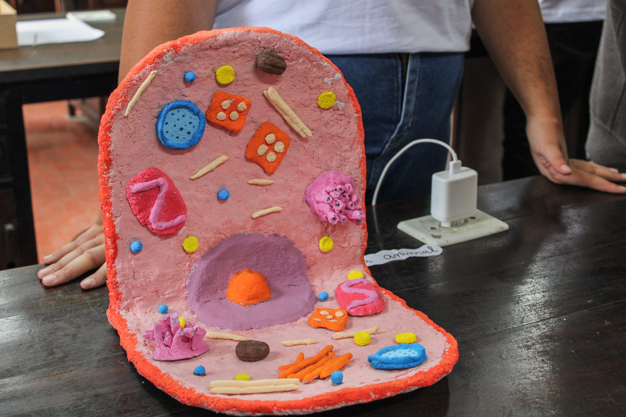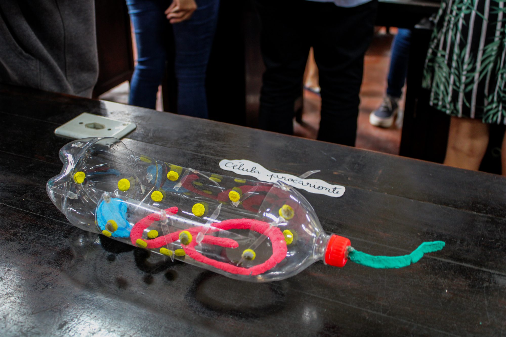Já a segunda oficina, também realizada pelo Pibid, apresenta o interior das células com maquetes feitas de lixo reciclado – graças à proposta de lixo zero adotada pela Escola Estadual Dr. Albert Sabin (Ciep 156). Ana Clara Marques Alves Silva, uma das bolsistas envolvidas no projeto, conta como foi o processo. “Nós buscamos reutilizar provas antigas dos alunos, papelão e garrafas plásticas para construir modelos didáticos de células procariontes e eucariontes. Tudo feito com o auxílio dos alunos”. Veja a seguir as fotografias das maquetes: