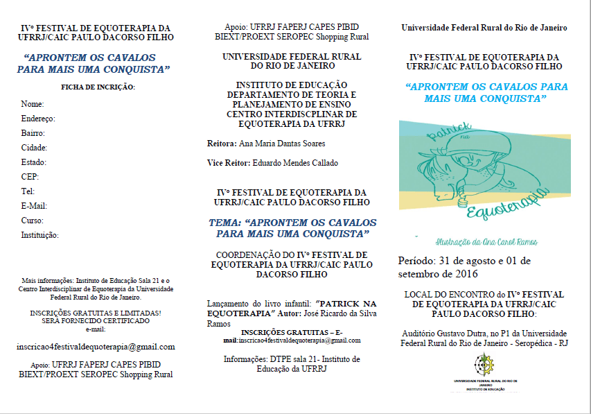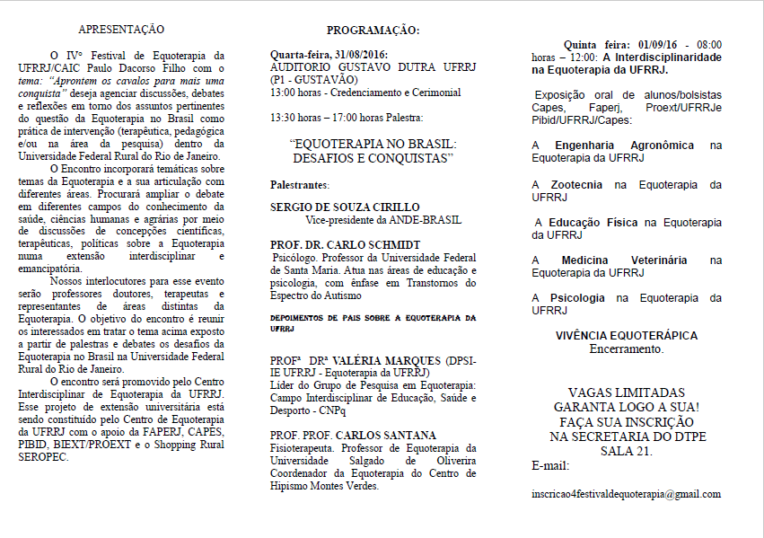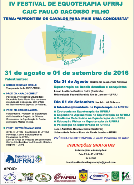 O Centro Interdisciplinar de Equoterapia da UFRRJ realizará, nos dias 31/08 e 01/09/2016, o IV Festival de Equoterapia da UFRRJ / CAIC Paulo Dacorso Filho.