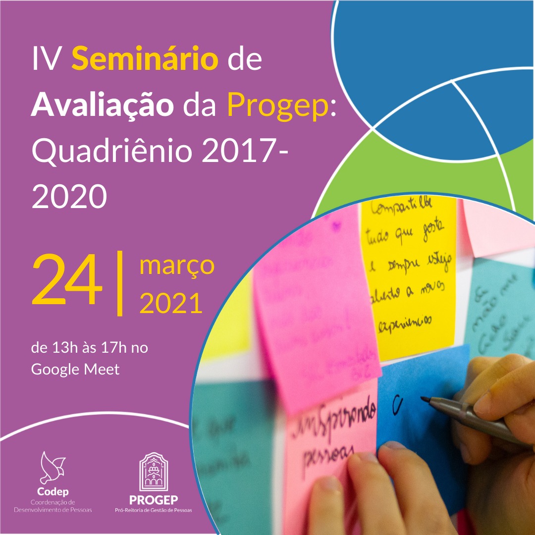 Convidamos todos os servidores da Pró-Reitoria de Gestão de Pessoas (Progep) a participarem do IV Seminário de Avaliação Institucional no dia 24 de março, das 13h às 17h. Essa edição do evento acontecerá em formato digital, pela plataforma Google Meet (https://meet.google.com/uds-hxfu-gkm), e tem como objetivo avaliar e refletir sobre o desempenho e conquistas da Progep no Quadriênio 2017-2020.