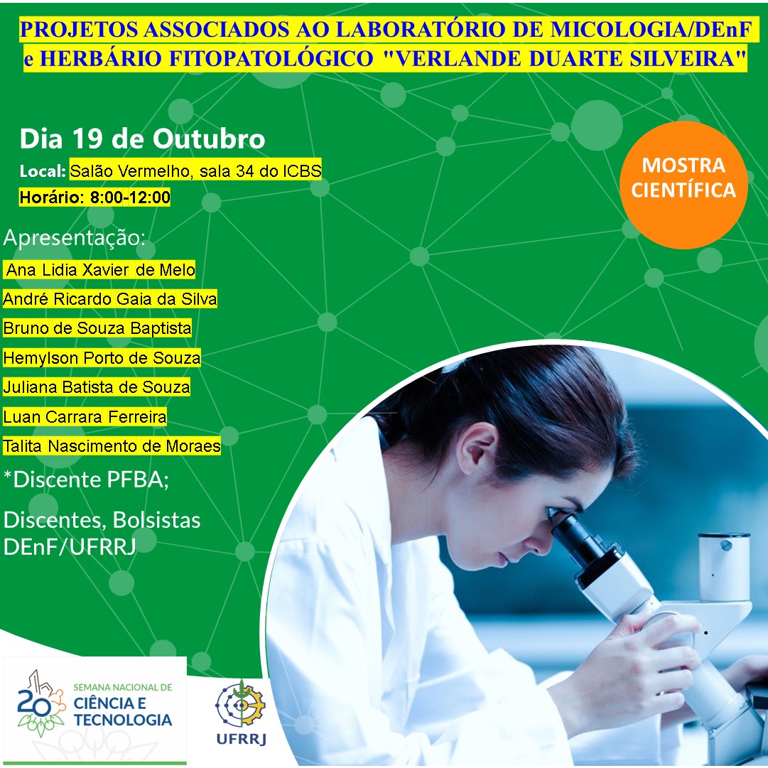 No dia 19/10, a partir das 8 horas, no Salão Vermelho do Instituto de Ciências Biológicas e da Saúde (ICBS) do câmpus Seropédica, acontecerá a mostra científica Projetos Associados ao Laboratório de Micologia/DEnF e Herbário Fitopatológico “Verlande Duarte Silveira”, em que serão apresentados os resultados de diversas pesquisas científicas desenvolvidas no âmbito do Herbário Fitopatológico. Clique aqui para consultar a programação completa da mostra.