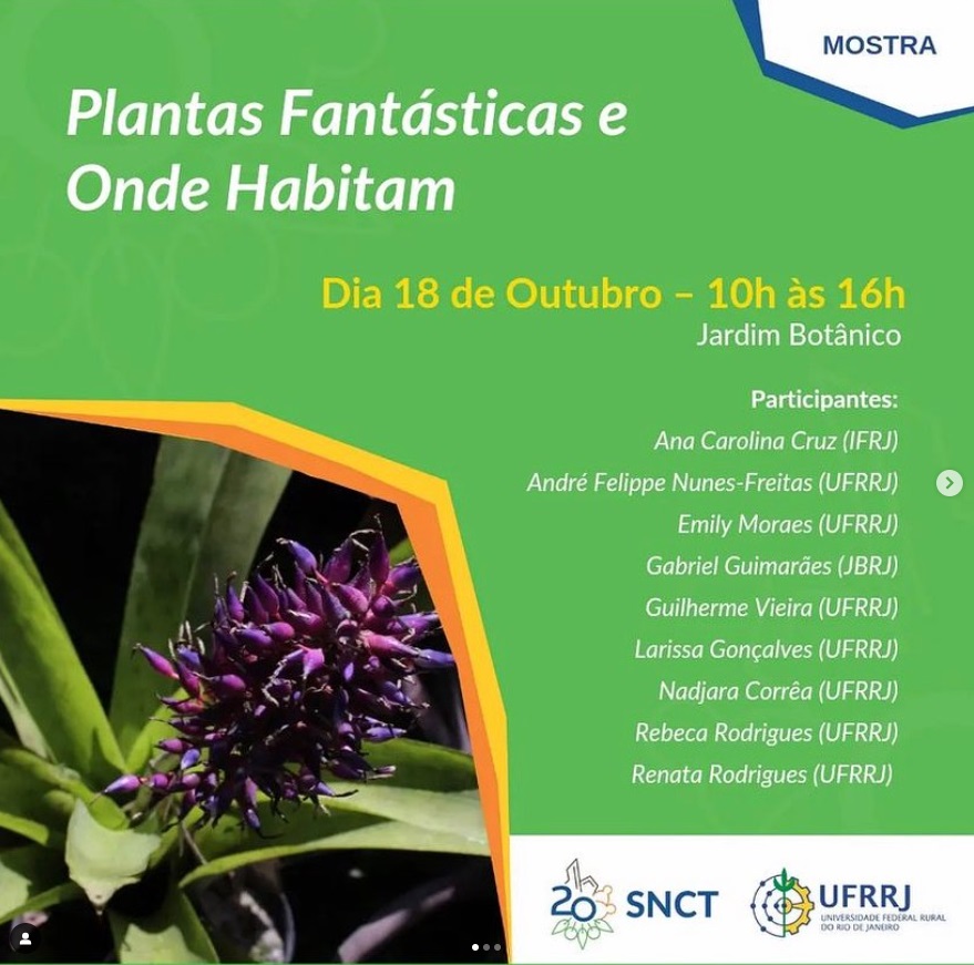 No dia 18/10, o JB/UFRRJ será palco da mostra científica Plantas fantásticas e onde habitam. Das 10 às 16 horas, os participantes poderão aprender sobre a diversidade de plantas vasculares que ocorrem em diversos ecossistemas tropicais, além de refletir sobre o impacto das mudanças climáticas na distribuição destas espécies, por meio de jogos didáticos e de uma trilha guiada pelo Jardim Botânico para a observação de plantas em diferentes ambientes.