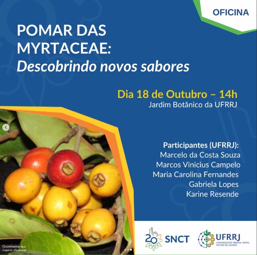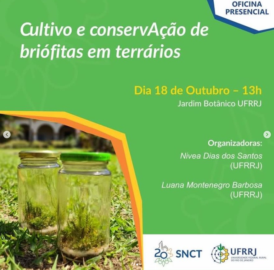 Ao longo do dia 18/10, o público também poderá participar de três oficinas. Às 10 horas, o tema será a Colagem com Elementos Naturais: Conexão com a Mata Atlântica. Já às 13 horas, acontecerá a oficina Cultivo e conservAção de briófitas em terrário. E, das 14 às 16 horas, será promovida a oficina Pomar das Myrtaceae: descobrindo novos sabores, com visita ao Pomar Graziela Maciel Barroso (Pomar das Myrtaceae), que abriga plantas frutíferas ainda pouco exploradas pela população. A família Myrtaceae, representada pelas espécies das pitangas, araçás, jabuticabas, gabirobas e cambucás, possui mais de mil espécies com frutos carnosos e saborosos.