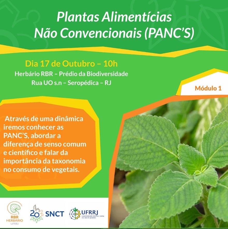 Já no Herbário RBR do Departamento de Botânica da UFRRJ, o destaque da programação são as plantas alimentícias não convencionais (PANC’s) e as begônias. No dia 17/10, acontecerá a oficina Plantas Alimentícias Não Convencionais (PANC’S) – a divulgação científica das espécies do acervo do Herbário RBR. Por meio de dinâmicas de grupo, os participantes irão aprender mais sobre as PANC’s e sobre a importância da taxonomia no consumo de vegetais. Posteriormente, serão apresentadas o que são coleções botânicas e como funcionam os herbários. Por fim, o público poderá vivenciar o trabalho dentro de um herbário, por meio de ações imersivas e da produção de uma miniexsicata.