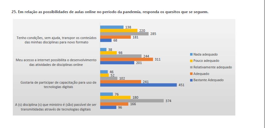 O levantamento realizado entre os dias 26/5 e 5/6 contou com a participação de 72% dos professores (892) . O questionário era composto por questões como habilidade e usos das tecnologias, acesso a ferramentas e à rede, necessidade de capacitação e observação de atividades com os estudantes. Na imagem abaixo, destacamos a avaliação dos docentes sobre condições e possibilidades de aulas no período da pandemia.