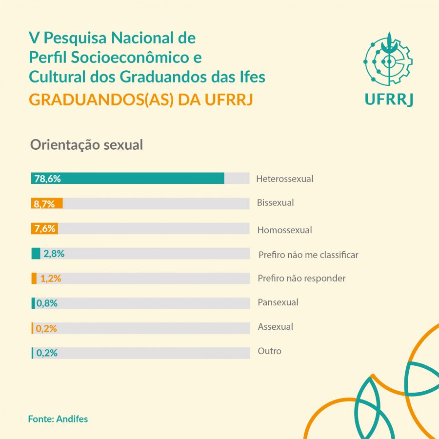 A maioria dos graduandos é jovem: 63,3% têm até 24 anos de idade. Quanto à orientação sexual, 21,4% não se declaram heterossexuais. Os estudantes também responderam a perguntas sobre atividades culturais e qualidade de vida, além de questões sobre dificuldades educacionais. Participaram 15.926 discentes de cursos de graduação da UFRRJ. Confira nos infográficos abaixo algumas das informações em destaque.