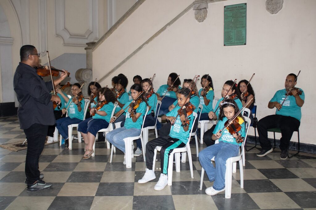 E a programação continuou com ainda mais atividades: no dia 02 de dezembro, a partir das 15h, o Prédio Principal (P1) se transformou novamente em um grande palco de arte, apresentações e celebração das produções das turmas do CAC. Tivemos como atração: Orquestra Jovem de Itaguaí, com uma linda apresentação de violino no jardim do Prédio Principal (P1). Além de exposições das turmas de: Criaturas do Barro, Criação Artística, Desenho e Pintura e Crochê.