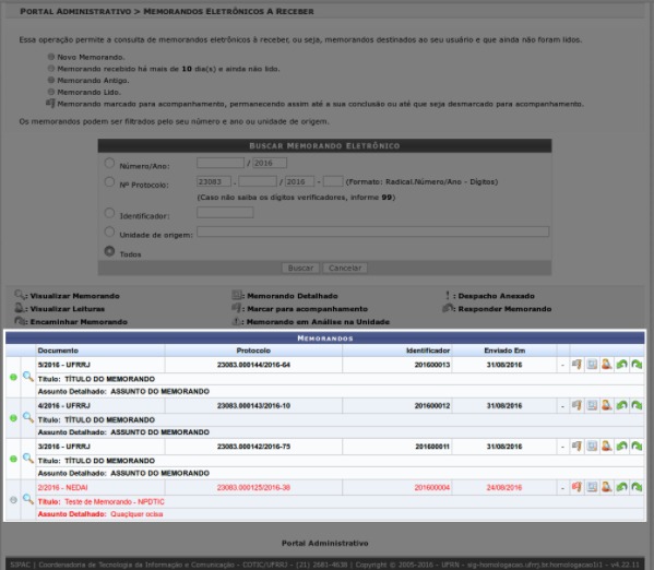 3. Na tela exibida, será possível ver os memorandos que aguardam o recebimento (destacados em negrito) e os marcados para acompanhamento (em vermelho).