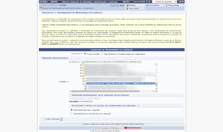 2. Na tela seguinte, selecione a unidade ou o responsável que receberá o memorando, se quer enviar cópias para outras unidades e/ou responsáveis e clique no botão “Continuar”;
