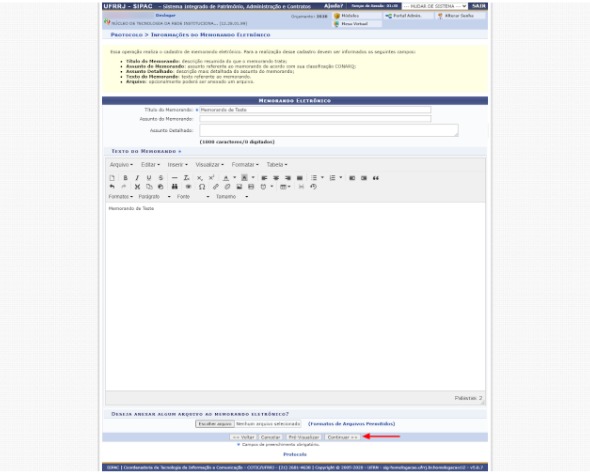 3. Na próxima tela, cadastre o conteúdo do memorando, anexe um ou mais arquivos e clique em “Continuar” para prosseguir;
